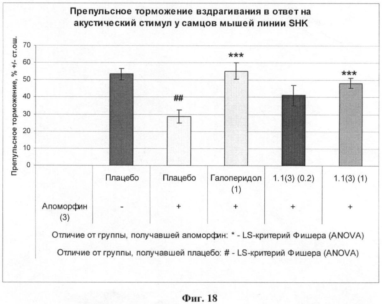 Аппарат состоял из камеры, выполненной из прозрачного плексигласа (производитель – компания Коламбус Инструменте, США), размещенной на платформе, которая находилась внутри звукоизолирующего кабинета. В 2 см от платформы находилась высокочастотная звуковая колонка, через которую передавались звуковые стимулы. При вздрагивании животного возникали колебания платформы, которые улавливались аналоговым преобразователем и регистрировались компьютером. Уровень фонового шума составлял 65 дБ. Животные получали по 4 предъявления одиночного тестирующего («пульсового») стимула длительностью 50 мс и громкостью 105 дБ или предваряющего («пре-пульсового») стимула длительностью 20 мс громкостью 85 дБ, за которым через 30 мс следовал пульсовой стимул длительностью 50 мс громкостью 105 дБ. Интервал между повторными предъявлениями пульсового или пре-пульсового в сочетании с пульсовым стимулом составлял 10 с.Ослабление вздрагивания в ответ на пульсовой стимул при наличии пре-пульсового стимула рассчитывали в процентах по отношению к амплитуде вздрагивания в ответ на изолированный пульсовой стимул. Результаты эксперимента представлены на фиг.18.