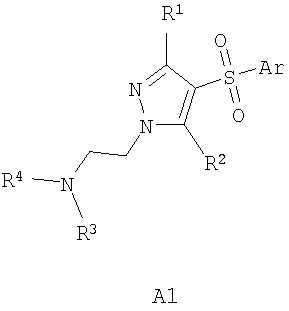 В литературе имеется значительное число публикаций, посвященных различным биологически активным сульфонилпроизводным азагетероциклов, в том числе лигандам серотониновых рецепторов. Так, например, известны замещенные 1-(2-аминоэтил)-4-арилсульфонил-пиразолы общей формулы А1, как лиганды серотониновых 5-HT2c рецепторов [WO 2003057674 А1], и 7-амино-3-сульфонил-пиразоло[1,5-а]пиримидины А2, как антагонисты серотониновых 5-НТ6 рецепторов [ЕР 941994 А1, 1999],