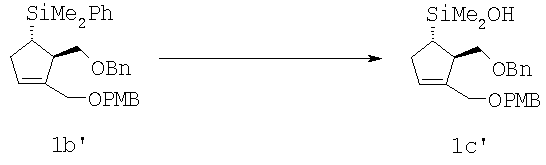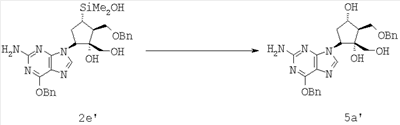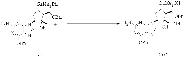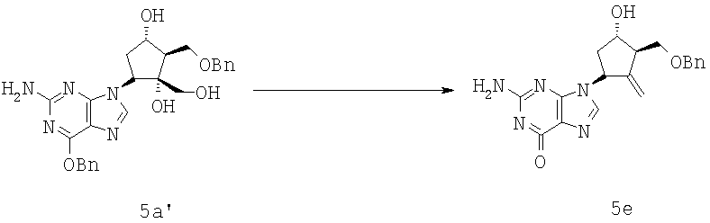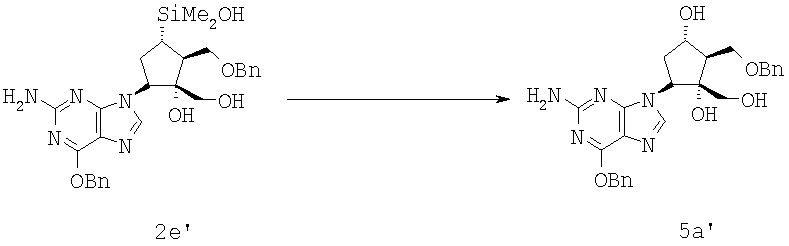 Соединение формулы 2е’ (2,00 г, 3,64 ммол., 1,0 экв.) растворяли в метаноле (50 мл) и нагревали до 65°С. КНСО3 (1,09 г, 10,9 ммол., 3,0 экв.) растворяли в воде (5,0 мл) и добавляли к раствору. KF (0,423 г, 7,28 ммол., 2,0 экв.) растворяли в воде (1,2 мл) и также добавляли. В течение 30 мин частями добавляли 30 вес.% раствора Н2O2 (1,20 мл, 10,9 ммол., 3,0 экв.). Смесь перемешивали при 68°С в течение 3 ч и добавляли еще Н2O2 (1,20 мл, 10,9 ммол., 3,0 экв.). Через 4 ч добавляли еще Н2O2 (0,60 мл, 5,45 ммол., 1,5 экв.). Смесь охлаждали до 25°С и доводили рН до величины 7 с помощью 6 М НСl. NaHSO3 (2,80 г) растворяли в воде (6 мл) и добавляли при 10°С к реакционной смеси, которую затем нагревали до комнатной температуры и перемешивали до тех пор, пока не перестала обнаруживаться перекись. Смесь концентрировали для удаления метанола. Добавляли воду (20 мл) и этилацетат (100 мл), фазы разделялись. Водный слой обрабатывали 2 раза этилацетатом (2×100 мл) и концентрировали соединенные органические фазы. Полученный твердый продукт суспендировали в этилацетате (20 мл) и отфильтровывали. Остаток промывали этилацетатом (50 мл) и водой (30 мл). Остаток сушили при 40°С, получали соединение формулы 5а’ в виде белого твердого продукта (1,78 г, количественный выход), который использовали на следующей стадии без очистки.
