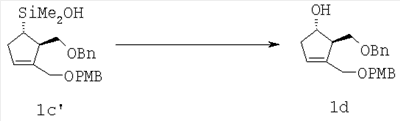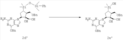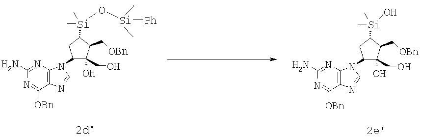 Условие (1): соединение формулы 2d’ (20 мг, 0,029 ммол., 1,0 экв.) растворяли в ТГФ (0,200 мл) и охлаждали до 0°С. Добавляли тетрабутиламмонийфторид (TBAF) (0,030 мл, 0,029 ммол., 1,0 М в THF, 1,0 экв.) и смесь нагревали до комнатной температуры. Реакция затухала через 2 ч, смесь затем охлаждали до 0°С и добавляли дополнительное количество TBAF (0,030 мл, 0,029 ммол., 1,0 М в ТГФ, 1,0 экв.). Эту процедуру повторяли 3 раза до достижения конверсии 95%. Продукт передавали в колонку и элюировали с градиентом 25% этилацетата в гексанах – 100% этилацетата и 10-30% метанола в этилацетате. Соединение формулы 2е’ было загрязнено его димером.