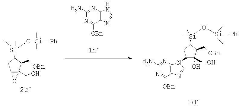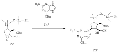 1Н ЯМР (360 MHz, СD3OD) 7.80 (s, 1H), 7.34-7.27 (m, 5H), 5.31-5.27 (m, 1H), 5.30 (s, 1H), 5.02 (s, 1H), 4.57 (s, 2H), 3.78 (dd, J=9.3, 4.8 Hz, 2H), 3.71 (dd, J=9.3, 4.8 Hz, 1H), 2.84 (s, 1H), 2.17-2.13 (m, 2H), 1.39-1.37 (m, 1H), -0.00 (s, 6Н); 13С ЯМР (90 MHz, CD3OD) 5 159.4, 155.2, 153.9, 153.1, 139.6, 138.6, 129.5, 129.0, 128.8, 117.4, 112.1, 74.3, 73.6, 59.7, 45.8, 34.9, 28.3, -1.31; MS (LC-MS)=426 (M+H+); HRMS m/e рассчит. для C21H28N5O3Si (M+H+): 426.1961, найдено 426.1963; mp=193.3°C.