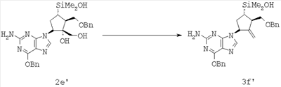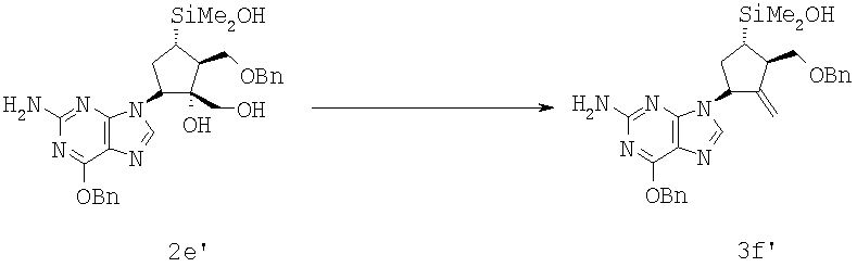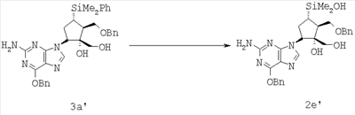 Соединение формулы 3а’ (описано в заявке PCT/US03/39554 и в заявке США 10.734012 как соединение формулы 78А) (10,0 г, 16,4 ммол., 1,0 экв.) растворяли в DMSO (100 мл) с получением светло-коричневого раствора, который охлаждали до 13°С, используя ледяную баню. Добавляли трет-бутоксид калия (14,4 г, 131 ммол., 8,00 экв.) с получением густой светло-коричневой суспензии, которую нагревали до комнатной температуры. Через 2 ч по данным ЖХВР оставалось 0,1 RAP исходного соединения. Реакционную смесь частями добавляли в воду (600 мл) при 13-15°С. рН доводили до 8,2 при помощи 6 М НСl, суспензию отфильтровывали и промывали водой (2×100 мл). Продукт сушили при 40°С в течение 60 ч. Осуществляли несколько стадий очистки. Лучшие результаты получали при суспендировании продукта коричневого цвета (3,90 г) в этилацетате (20 мл), фильтровании и промывании осадка этилацетатом (2×20 мл). После соединения нескольких партий выделяли соединение формулы 2е’ (всего 6,48 г) в виде почти белого твердого продукта с примесями при АР 91,6-96,0 (выход 72%).