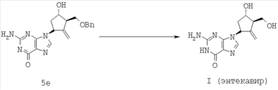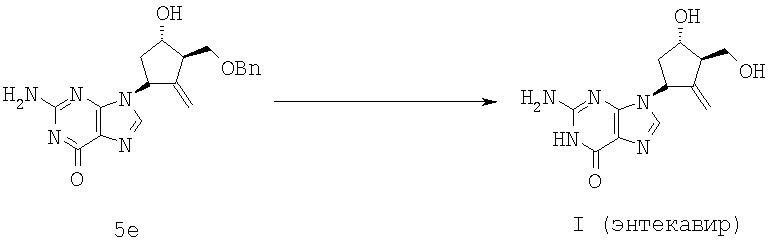 К раствору 5е (2,0 г, 5,44 ммол.) в метиленхлориде (20 мл), охлажденному до -20°С, добавляли раствор треххлористого бора в метиленхлориде (1 M, раствор, 22 мл, 22 ммол., 4,04 экв.) в течение ~30 мин. Во время добавления температуру поддерживали равной -19°÷-23°С. После перемешивания в течение еще 3 ч при -20°С для обрыва реакции добавляли метанол (14 мл). Реакционную смесь перемешивали до отсутствия боранового эфира по данным ЖХВР (~4 ч). Добавляли МТВЕ (30 мл) и перемешивали реакционную смесь в течение суток при комнатной температуре. Полученный твердый продукт фильтровали, промывали МТВЕ (~5 мл) и сушили под вакуумом при комнатной температуре с получением 1,66 г гидрохлоридной соли энтекавира. Гидрохлоридную соль (0,72 г, 2,29 ммол.) отбирали в ~13 мл воды и нагревали до ~40°С. Величину рН доводили до ~7 при помощи 2 N NaOH. Получали разбавленную суспензию, нагревали ее до 80-85°С и обрабатывали активированным углеродом (0,12 г). Через 30 мин нагревания с обратным холодильником горячую смесь фильтровали через целит. Фильтрат охлаждали до комнатной температуры в течение 3 ч и затем перемешивали 2 ч при 0°С. Полученные кристаллы отфильтровывали, промывали водой сушили под вакуумом, получая соединение формулы (I) (энтекавир) (0,32 г, общий выход из 5е равен 44%).