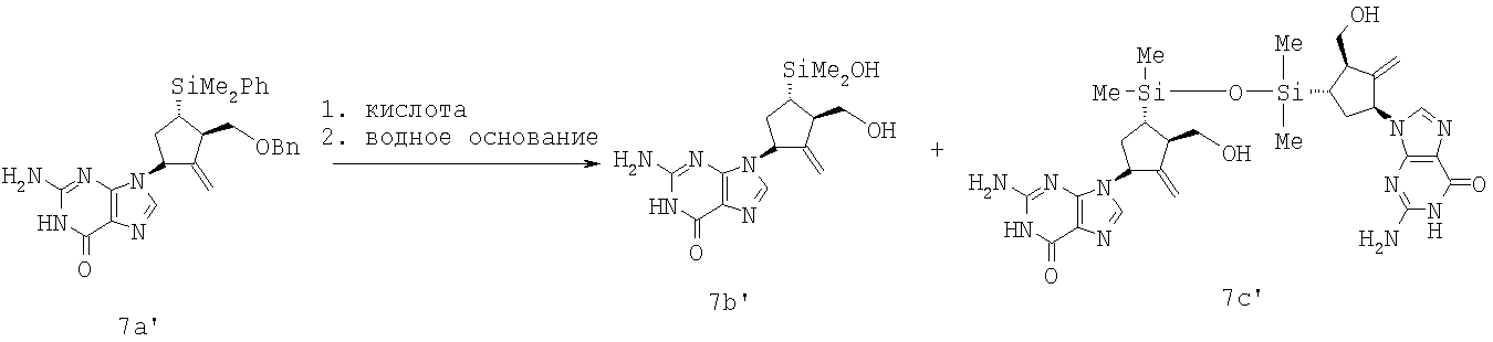 В сосуд объемом 1000 мл с рубашкой, снабженный отделенной мешалкой, термометром, воронкой для добавления веществ и вводом для азота, загружали соединение 7а’ (40 г), DCM (180 мл) и сульфолан (20 мл) и охлаждали реакционную смесь до 10-15°С. По каплям добавляли в сосуд MSA (14,48 г, 2 экв.), поддерживая температуру реакционной смеси ниже 15°С. Затем реакционную смесь охлаждали до температуры около 5-10°С. Затем, поддерживая температуру реакционной смеси ниже примерно 10°С, медленно добавляли TFMSA (22 мл, 3,2 экв.). Реакционную смесь нагревали до комнатной температуры и перемешивали в течение суток. После завершения реакции по данным ЖХВР реакционную смесь охлаждали до 0-10°С и медленно добавляли 2 N NaOH (360 мл), поддерживая температуру в сосуде ниже 15°С. Полученную суспензию нагревали до комнатной температуры и перемешивали в течение примерно 1,5 ч. Добавляли толуол (600 мл) и перемешивали смесь 30 мин. Обогащенный водный раствор промывали толуолом (2×600 мл), разбавляли водой (370-375 мл) и обрывали реакцию ледяной уксусной кислотой при 80-85°С, доводя величину рН раствора до 6,8-7,2. После выдержки суспензии в течение 2 ч при 80-85°С и в течение 4 ч при комнатной температуре ее затем охлаждали до 0-10°С и перемешивали 1-1,5 ч. Затем суспензию фильтровали, промывали водой (2×80 мл), гептаном (2×80 мл) и сушили под вакуумом при 55°С с получением 23,26 г соединения 7b’ (выход 84,6%) (может содержать около 5-15% соединения 7 с’). LC/MS для 7с’: время удерживания = 5,95 мин; (М+Н)=653. (Условия ЖХВР: растворитель А: 5% СН3CN, 95% Н2О, 10 мМ NH4OAc; Растворитель В: 95% СН3СN, 5% H2O, 10 нМ NH4OAc, время градиента: 15 мин; начальный % В=О’, конечный % В=100; скорость истечения 2,2 мл/мин; колонка = Luna C18, 50×4,6 мм, длина волны = 210 нМ).