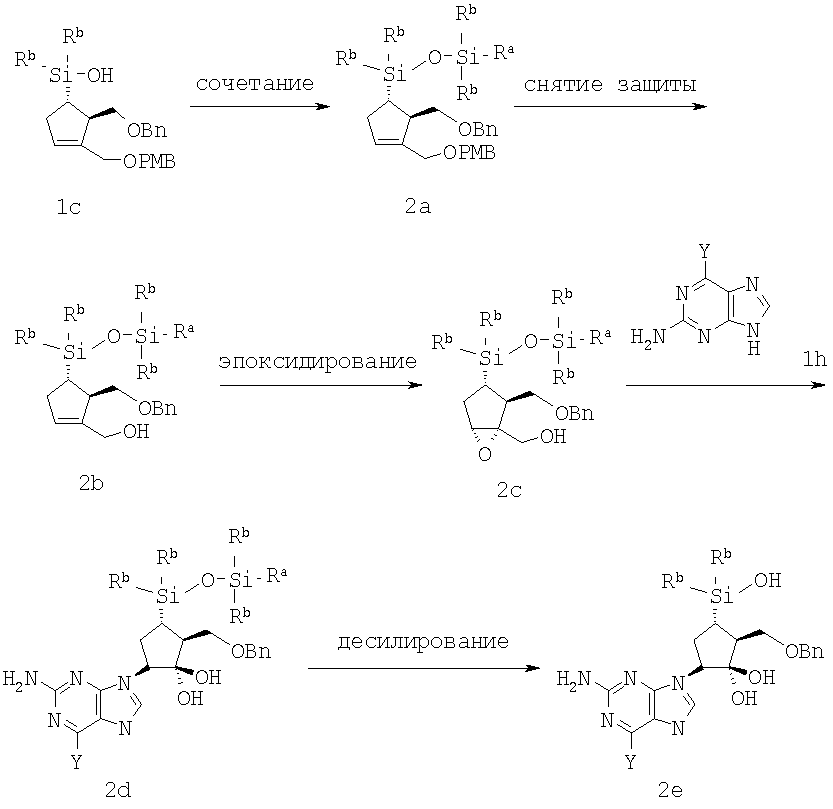 гда Ra каждый Rb и Y имеют значения, указанные выше, и (е) превращение соединения формулы 2d с получением соединения формулы 2е путем десилилирования