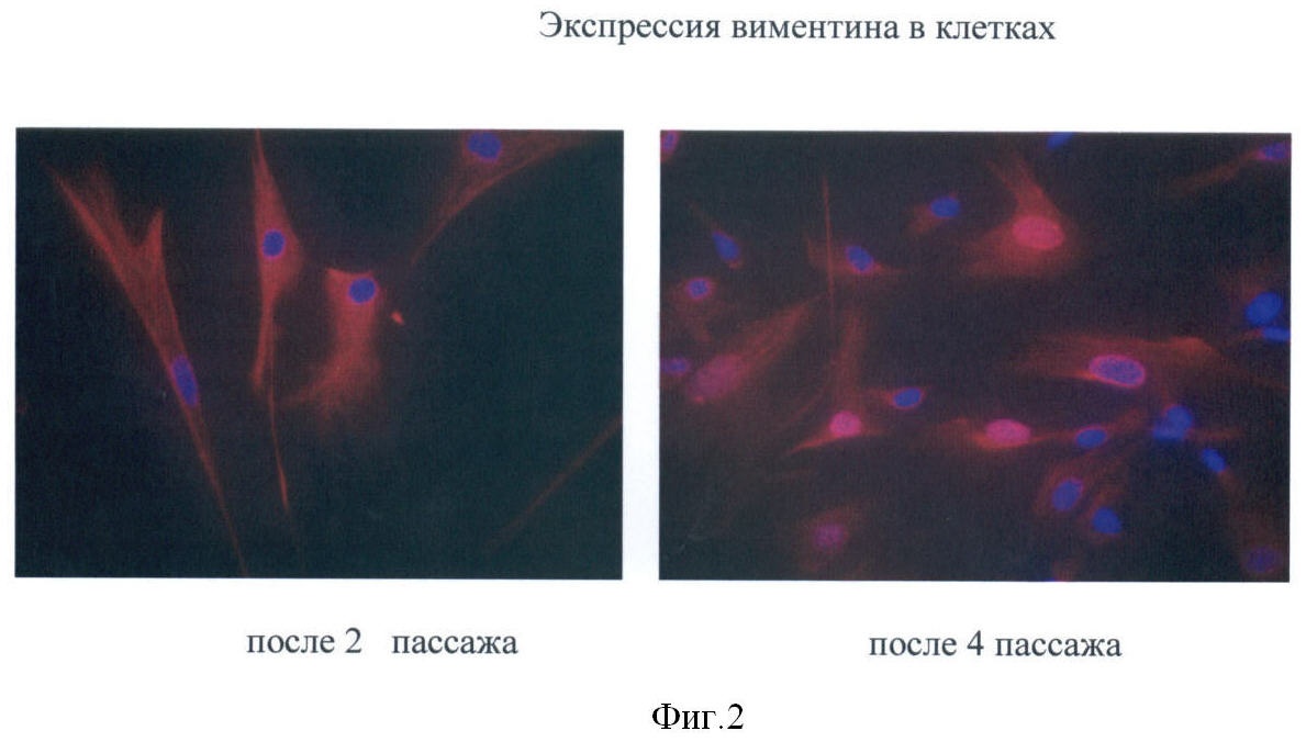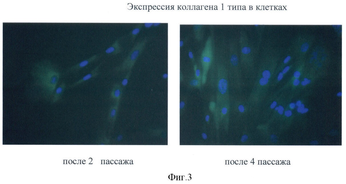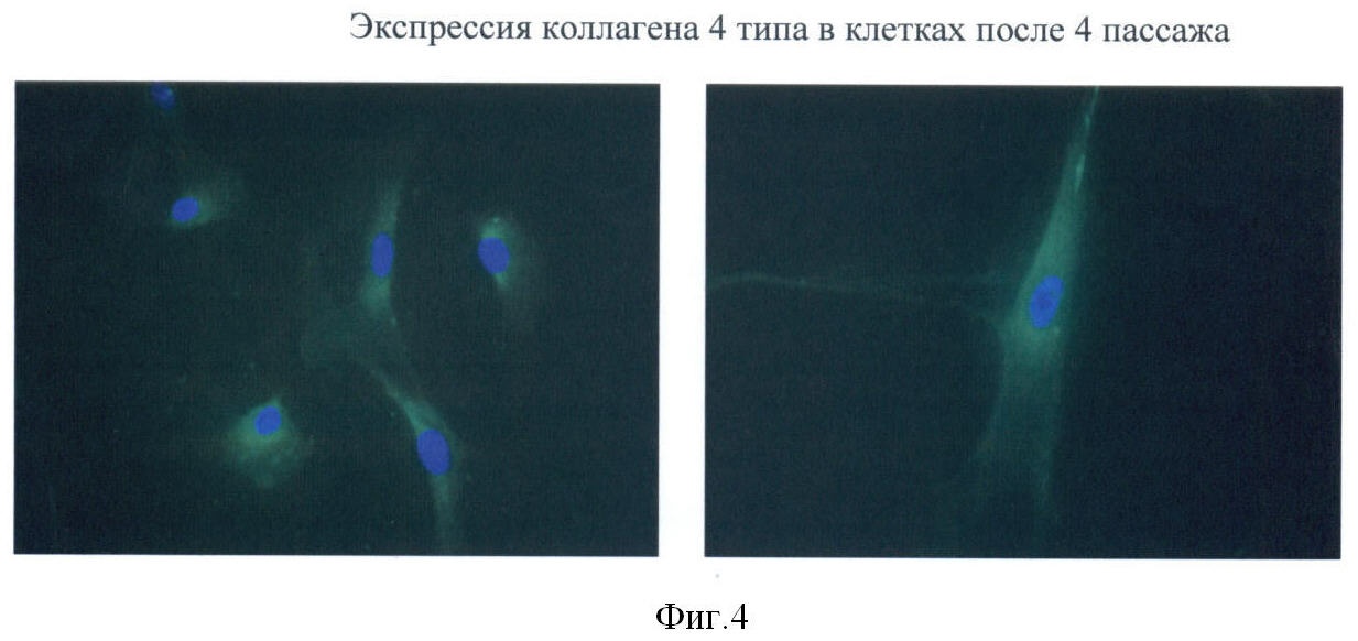 Культивируемые фибробластоподобные клетки, полученные из пупочного канатика человека, экспрессируют виментин, коллаген 1 и 4 типа (Фиг.2-4), альфа-актин и др. (хондроитин сульфат, эластин, фибронектин, кератин 18, кератин 19, гепарин сульфат), не экспрессируют CD45, CD11b, CD14, имеют низкую экспрессию антигенов гистосовместимости.