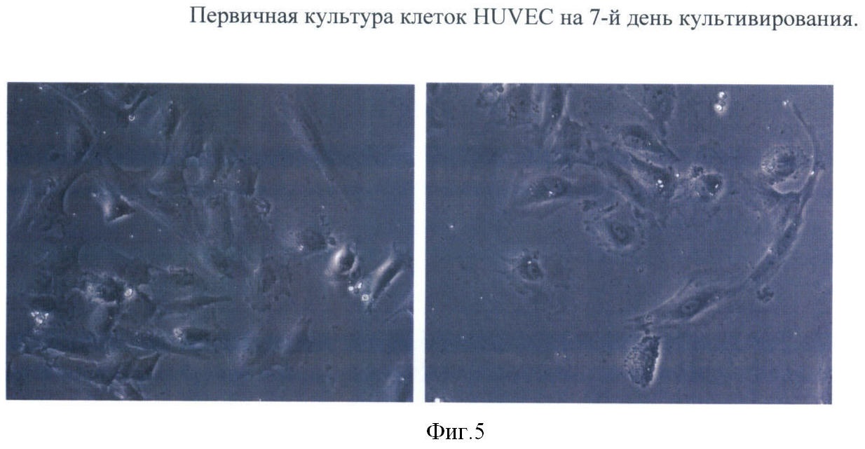 Как правило, используют эндотелиальные клетки вены пупочного канатика нулевою пассажа (непассированные). Эндотелиальные клетки характеризуются ростом в культуре только в прикрепленном к поверхности культуральной посуды (чашки Петри или культуральные флаконы) состоянии и имеют характерный для эндотелиоцитов фенотип (Фиг.5).