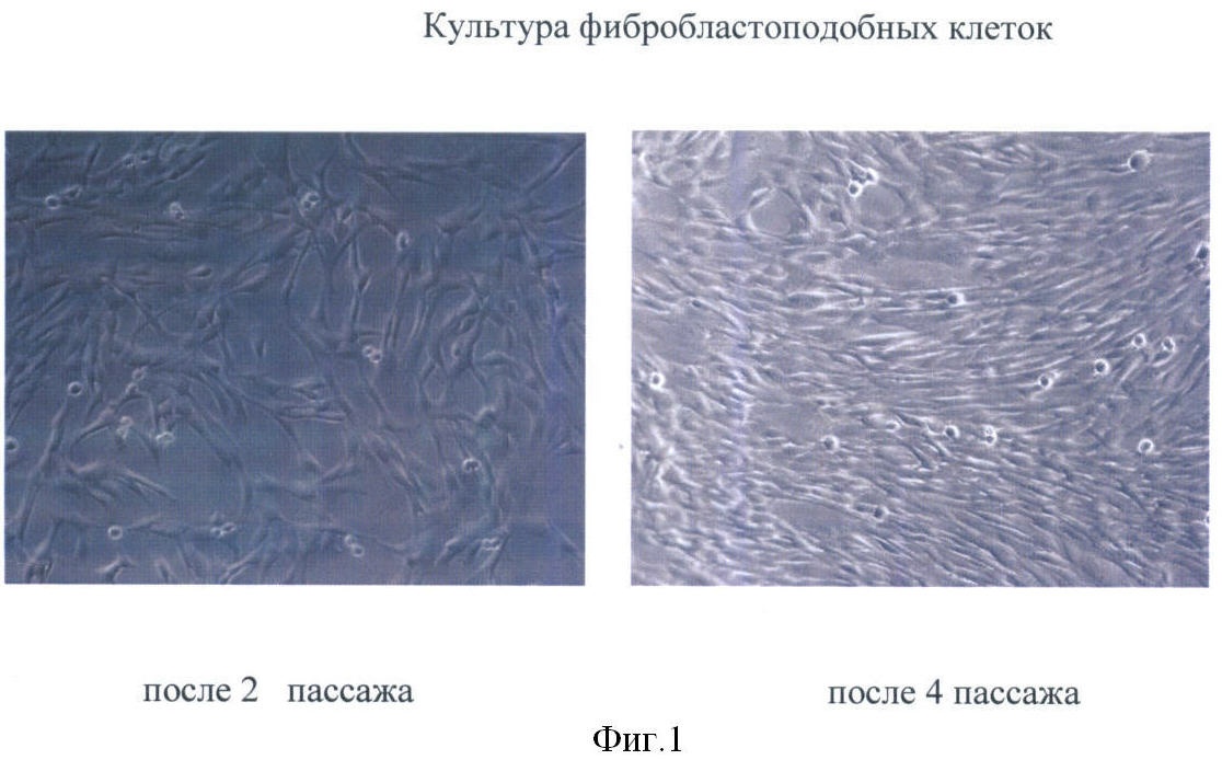 Культивируют клетки в стандартных условиях: при 37°С и 5% СО2, со сменой среды каждые 2-3 дня. Культуры пассируют при достижении клетками 70-80% конфлюентности. Перед пассированием сливают среду, 3 раза промывают чашку раствором Версена (фирмы ПанЭко или аналогичный). На 4-7 минут заливают содержимое чашки 0,25% раствором трипсина. Полученную суспензию клеток, равномерно перемешав, распределяют на новые чашки Петри Greiner или Corning в плотности 8-15 тыс. клеток/см2. Первое пассирование проводят через 12-14 дней после посадки. В дальнейшем удвоение количества фибробластоподобных клеток происходит каждые 48-72 часа. Соответственно, начиная со второго пассажа, между пассажами проходит 2-3 суток.