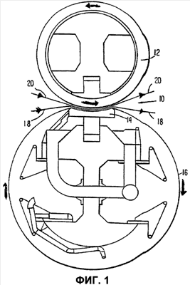 На Фиг.1 показан вид сбоку в разрезе пресса с длинной зоной зажима, предназначенного для обезвоживания волокнистого полотна, из которого при обработке на бумагоделательной машине получают бумажный лист. Зона 10 зажима ограничена гладким цилиндрическим прессовым валком 12 и дуговидной прижимной станиной 14. Дуговидная прижимная станина 14 имеет приблизительно такой же радиус кривизны, что и цилиндрический прессовый валок 12. Для управления сдавливанием в зоне 10 зажима, расстояние между цилиндрическим прессовым валком 12 и дуговидной прижимной станиной 14 можно регулировать при помощи гидравлического привода или подобного ему устройства, присоединенного к дуговидной прижимной станине 14. Гладкий цилиндрический прессовый валок 12 может представлять собой управляемый валок с выпуклой бочкой, пригнанный по дуговидной прижимной станине 14 для достижения равномерного профиля сдавливания в поперечном направлении. Очень часто профиль влагосодержания листа в направлении CD имеет форму дуги с поднятыми (“«улыбка», smile”) или опущенными уголками (“гримаса, frown”). Механическая коррекция профиля часто неэффективна или проходит неудовлетворительно.