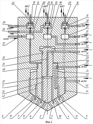Аналогично под вторую втулку 8 по каналу 43 высокого давления, кольцевой проточке 44 в корпусе форсунки 1 поступает топливо от третьего независимого ГА 100.