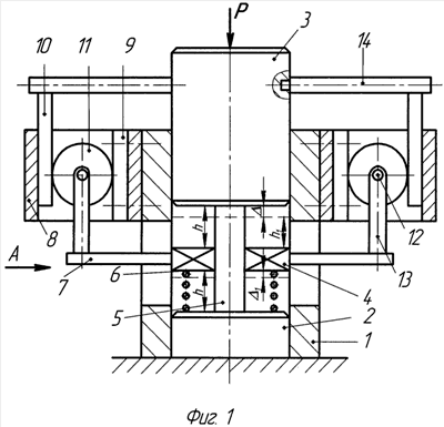 Вначале без нагружающего захвата 3 устанавливают заготовку 5, проталкивая ее между секторами поддерживающего элемента 4, на опорный захват 2, после чего сверху по отверстию корпуса 1 ставят нагружающий захват 3 на заготовку 5. При этом штанга 14 должна касаться зубчатой рейки 10, а поддерживающий элемент, опираясь на пружину 6, должен в исходном положении устанавливаться посередине заготовки 5, концевые выступающие из элемента 4 части которой равны до начала сжатия h=(1 2)d (см. фиг.1). Устройство в собранном виде устанавливают на рабочий стол пресса и производят нагружение заготовки силой Р через захват 3. Последний со штангой 14 при осадке заготовки на величину абсолютной деформации будет перемещаться относительно корпуса 1 также на эту же величину, передвигая заодно и подвижные рейки 10 вниз на указанную величину перемещения. При этом зубчатое колесо 11 радиусом r, обкатываясь по неподвижной рейке 9, будет также перемещаться вниз. Согласно представленной на фиг.2 схеме, где буквами о, b и а обозначены соответственно точки контакта колеса с рейками 9, 10 и осью 12 колеса 11, точку о можно рассматривать как мгновенный центр скоростей колеса, совершающего плоскопараллельное движение относительно рейки 9 [2]. Тогда линейная скорость перемещения точки b – Vb=2r будет в два раза больше скорости точки a – Va= r, где – угловая скорость вращения колеса относительно точки о. В связи с этим линейное перемещение оси колеса с упором 13 будет в два раза меньше величины перемещения подвижной рейки 10 – и равным 1= /2.