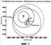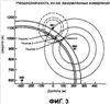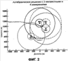 Фиг.1 – графическая иллюстрация примера трех измерений с неизвестными пространственными координатами пользователя и значением временного смещения тактового генератора и с двумя неоднозначными решениями по определению местоположения;
