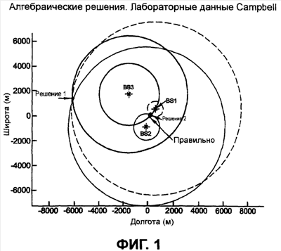 Во втором случае источником неоднозначности может быть особенность алгоритма, использованного для определения местоположения пользователя. Известный алгоритм, чувствительный к неоднозначности, описан в патенте США 6289280. Этот алгоритм находит неизвестные, используя систему уравнений в замкнутой форме. Поскольку этот алгоритм находит местоположение пользователя алгебраически, он работает эффективно, что делает его подходящим для приложений и устройств с ограничениями на время или ресурсы. В решении используются преобразования линейной алгебры для объединения результатов измерений в систему квадратных уравнений, где количество уравнений равно количеству неизвестных. Получается два решения, связанных с двумя корнями квадратных уравнений. Два решения образуют неоднозначный набор решений, которые необходимо разрешить дополнительными средствами.
