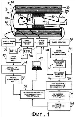Для формирования изображений сердечной системы вентильная схема 120 опционально сконфигурирована, чтобы выполнять мониторинг сердечного цикла, используя электрокардиограф 122 или иное устройство мониторинга сердечной системы. Вентильная схема 120 предоставляет тактовые сигнала как для части МРВ, так и для части ПЭТ ВП сканера 10 ПЭТ/МРВ, чтобы обеспечить, чтобы при формировании изображения ПЭТ ВР и формировании изображения МРВ данные получались в течение различных, выбранных частей сердечного цикла. Аналогичным образом может управляться пропускание других физиологических функций, таких как дыхание. Физиологическое управление отпирания предотвращает наведение на изображения ПЭТ ВП помех, вызываемых градиентами магнитного поля, которые генерируются в процессе работы части МРВ сканера. Более того, управление пропусканием с помощью физиологического состояния может направить часть формирования изображения ПЭТ ВП в интересную с функциональной точки зрения переходную фазу физиологического цикла, тогда как часть формирования изображения МРВ выполняется в более спокойной фазе физиологического цикла, когда морфологические свойства относительно неизменны.