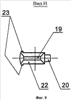 Ответный Т-образному выступу 19 паз 6 листа-пластины 5 выполнен в виде замкнутого выреза ступенчатого профиля в плане, соответствующего ступенчатому профилю в плане Т-образного выступа 19 (горизонтальной части 22 с запирающими боковыми выступами 23 и направляющей 20 Т-образного выступа 19). Запирающие боковые выступы 23 предназначены для запирания ответного паза 6, который состоит из последовательно связанных паза 24 (под горизонтальную часть 22), пазов 25 (под боковые выступы 23) и узкой части 26 (под направляющую 20). Протяженность узкой части – прорези 26 паза 6 не менее длины вертикальной части 21 Т-образного выступа 19 (фиг.5, 8, 9, 10).