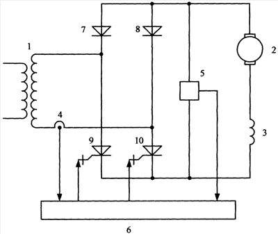Изобретение относится к области электротехники и может быть использовано на электроподвижном составе переменного тока. Технический результат заключается в повышении коэффициента мощности во всем диапазоне регулирования и надежности. В каждом полупериоде первый (7) или второй (8) диоды переходят в проводящее состояние, при этом второй (10) или первый (9) тиристор также переходит в проводящее состояние, так как блок управления (6) подает управляющий импульс на электрод управления тиристора. При переходе напряжения через «нуль» датчик напряжения (5) вырабатывает сигнал, по которому первый таймер, входящий в блок управления (6), обнуляется, а во второй таймер блока управления (6) записывается константа. При переходе тока через «нуль» датчик тока (4) вырабатывает сигнал, по которому содержимое первого таймера блока управления (6) фиксируется, при этом число, записанное в этом таймере, пропорционально тактовой частоте блока управления (6) и углу сдвига фазы тока. Второй таймер блока управления (6), в который записана константа в начале полупериода, продолжает счет на вычитание до тех пор, пока его содержимое не станет равно содержимому первого таймера блока управления (6). При равенстве значений первого и второго таймеров блок управления (6) вырабатывает импульс управления на выключение первого (9) или второго (10) тиристора. 1 ил.
