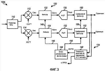 Фиг.3 изображает блок-схему беспроводного устройства 100b связи, которое реализует другой вариант осуществления настоящего изобретения. Как иллюстрируется на фиг.3, выборки от АЦП 130 и 132 передаются на цифровые фильтры 150 и 152 соответственно. Цифровые фильтры 150 и 152 функционируют способом, аналогичным описанному выше для фильтров 122 и 124. То есть цифровые фильтры 150 и 152 могут быть установлены на нормальную ширину полосы пропускания, когда интенсивность принимаемого сигнала выше первого порогового значения (Пор1).