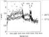 Для исследования взаимодействия между ОПН и гидроксиапатитом, а также между ОПН и слюной, проводили эллипсометрический анализ. На черетеже представлено влияние температуры на адсорбцию. На чертеже видно, что адсорбция ОПН на поверхности гидроксиапатита является практически линейной. Большее количество ОПН адсорбируется при более высокой температуре (37°С), хотя после промывки наблюдалась некоторая десорбция при 37°С при нагрузке поверхности 1 мг/м2. Для моделирования химического эффекта чистки зубов добавляли SDS на 5 минут в кювету, затем промывали буфером. После этой стадии очистки не было существенных различий в адсорбированном количестве при двух температурах.