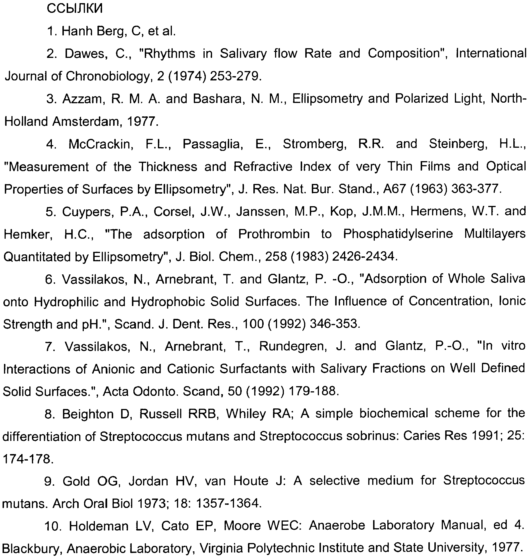 После взаимодействия ОПН с белками слюны на подложках из гидроксиапатита проводили эллипсометрию, которая является оптическим методом определения изменений в поляризации света после отражения от поверхности (3). В качестве измерительного прибора использовали тонкопленочный эллипсометр Rudolph 436 (Rudolph Research, Fairfieid, N.J.) с ксеноновой лампой с фильтром 4015 Å, работающий в режиме, как описано Landgren and Jönsson (1993). Для определения эллипсометрических углов и для непокрытой подложки устанавливали прибор в положение наименьшей интенсивности. Для оценки изменений и после адсорбции рассчитывали толщину и показатель рефракции адсорбированной пленки белка согласно McCrackin с соавт. (4), исходя из предположения, что пленка является однородной. Рассчитывали адсорбированную массу, Г (мг/м2), согласно Cuypers с соавт. (5). Как показано этими авторами, адсорбированная масса при небольшой степени покрытия поверхности может быть определена более точно, чем толщина и показатель рефракции пленки, поэтому именно этот параметр представлен в данных экспериментах. Использовали соотношение между молярной массой и молярной преломляющей силой и парциальным удельным объемом, равное 4,1 г/мл и 0,75 мл/г соответственно. Эти значения обычно используются для белков и ранее применялись в ряде исследований в отношении адсорбции компонентов слюны (см. ссылки 6, 7). Диски, обработанные, как описано выше в разделе «Подложки», помещали в кювету эллипсометра, содержащую буфер. Кювету термостатировали при 37°С, если не указано иначе, раствор перемешивали магнитной мешалкой. После того, как значения эллипсометрических углов стали стабильными, добавляли слюну в конечной концентрации 10 об. %. Адсорбцию измеряли 1 час, затем промывали кювету непрерывным потоком буфера 12 мл/мин в течение 5 минут. Затем проводили десорбцию в течение 25 минут. Это является стандартной методикой образования пелликулы. Для получения данных об адгезивных свойствах проводили эксперименты с добавлением SDS. В стандартном эксперименте добавляли SDS в концентрации 17 мМ [двойная ККМ (критическая концентрация мицеллообразования) в воде и примерно 9-кратная ККМ в буфере], после этого через 5 минут после добавления SDS окончательно промывали буфером.