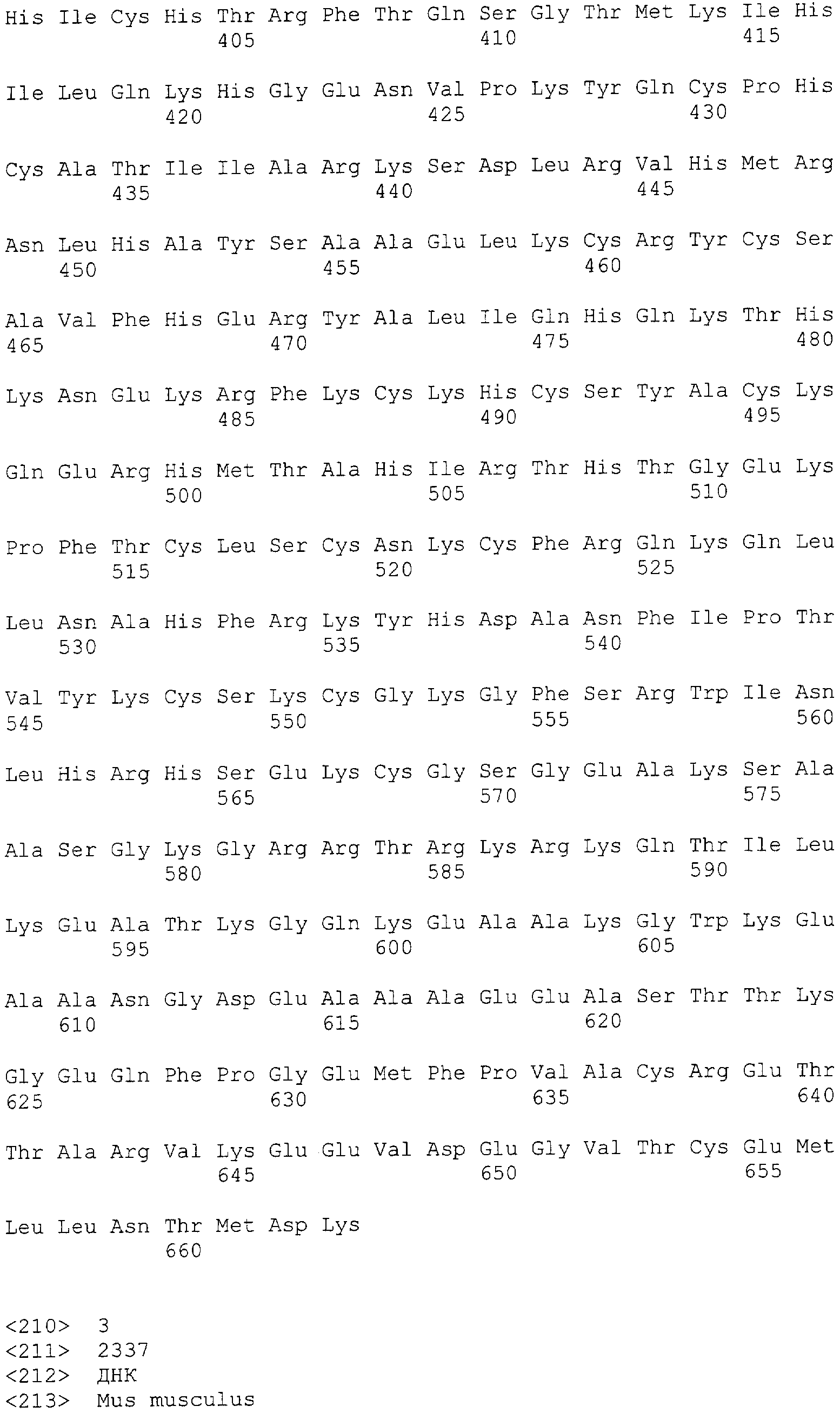 “Нефункциональный мутантный BORIS пептид, полипептид или белок” относится к молекуле BORIS, которая лишена возможности осуществить любую из важных активностей молекулы дикого типа BORIS, такую как ДНК-связывание, восстановление “отцовского” (“родительского”) паттерна ДНК-метилирования и т.д. “Нефункциональный мутантный BORIS пептид, полипептид или белок” имеет последовательность, которая, по меньшей мере, на 50%, 60% или 70% идентична последовательности человеческого (SEQ ID NO: 2) или мышиного (SEQ ID NO: 4) пептида, полипептида или белка BORIS, более предпочтительно, на 75%, 80%, 90%, 95%, 96%, 97%, 98% или 99% идентична последовательности человеческого (SEQ ID NO: 2) или мышиного (SEQ ID NO: 4) пептида, полипептида или белка BORIS.