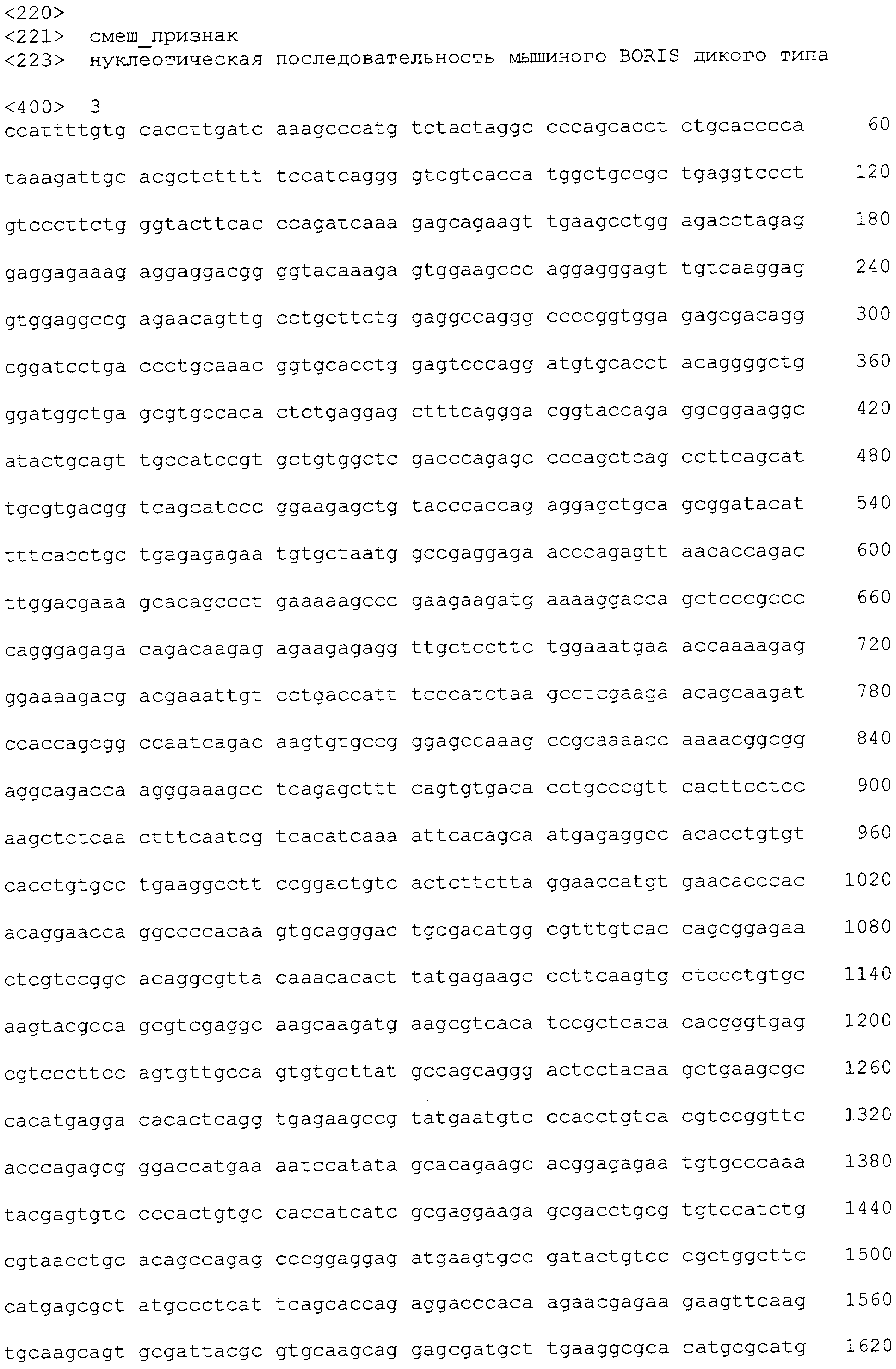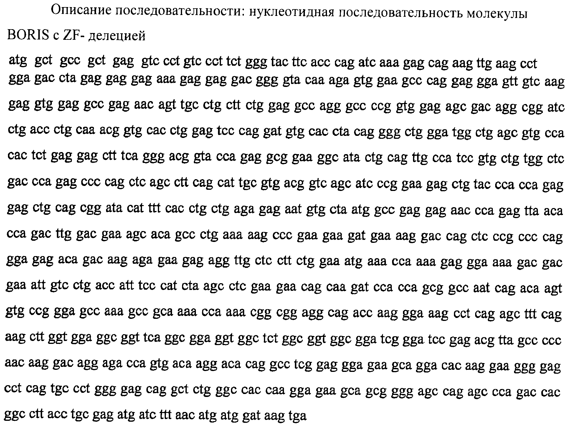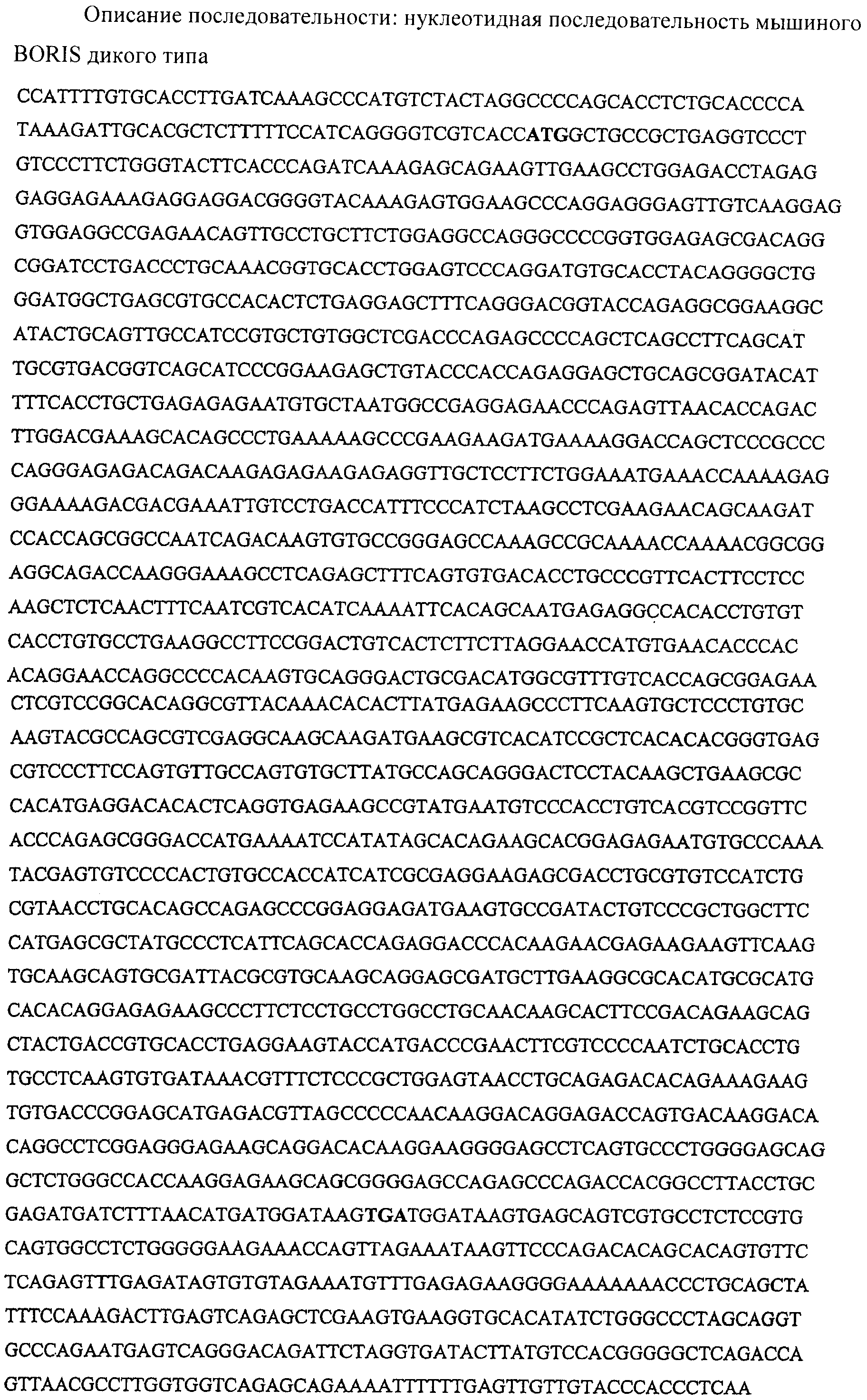 “Полинуклеотид, кодирующий нефункциональную мутантную форму BORIS” относится к любому полинуклеотиду, последовательность которого, по меньшей мере, на 50%, 60% или 70% идентична последовательности человеческого (SEQ ID NO: 1) или мышиного (SEQ ID NO: 3) полинуклеотида BORIS, более предпочтительно, на 75%, 80%, 90%, 95%, 96%, 97%, 98% или 99% идентична последовательности человеческого (SEQ ID NO: 1) или мышиного (SEQ ID NO: 3) полинуклеотида BORIS.