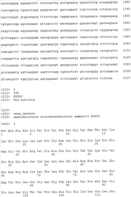 В одном варианте изобретения кДНК, кодирующую мышиный BORIS (mBORIS), получают методом RT-PCR на мРНК, выделенной из мышиного или человеческого яичка. ДНК-связывающий домен молекулы делегируется и заменяется малым спейсером, о котором известно, что он хорошо работает при создании антител-одноцепочечных Fv доменов. Корректная последовательность подтверждается автоматизированным анализом нуклеотидной последовательности. В полученной в результате молекуле отсутствуют 11 ZF доменов, и она состоит из N-концевой области m BORIS (аминокислоты 1-258), связанной с С-концевой областью (аминокислоты 573-636) через спейсер, содержащий 18 аминокислот.
