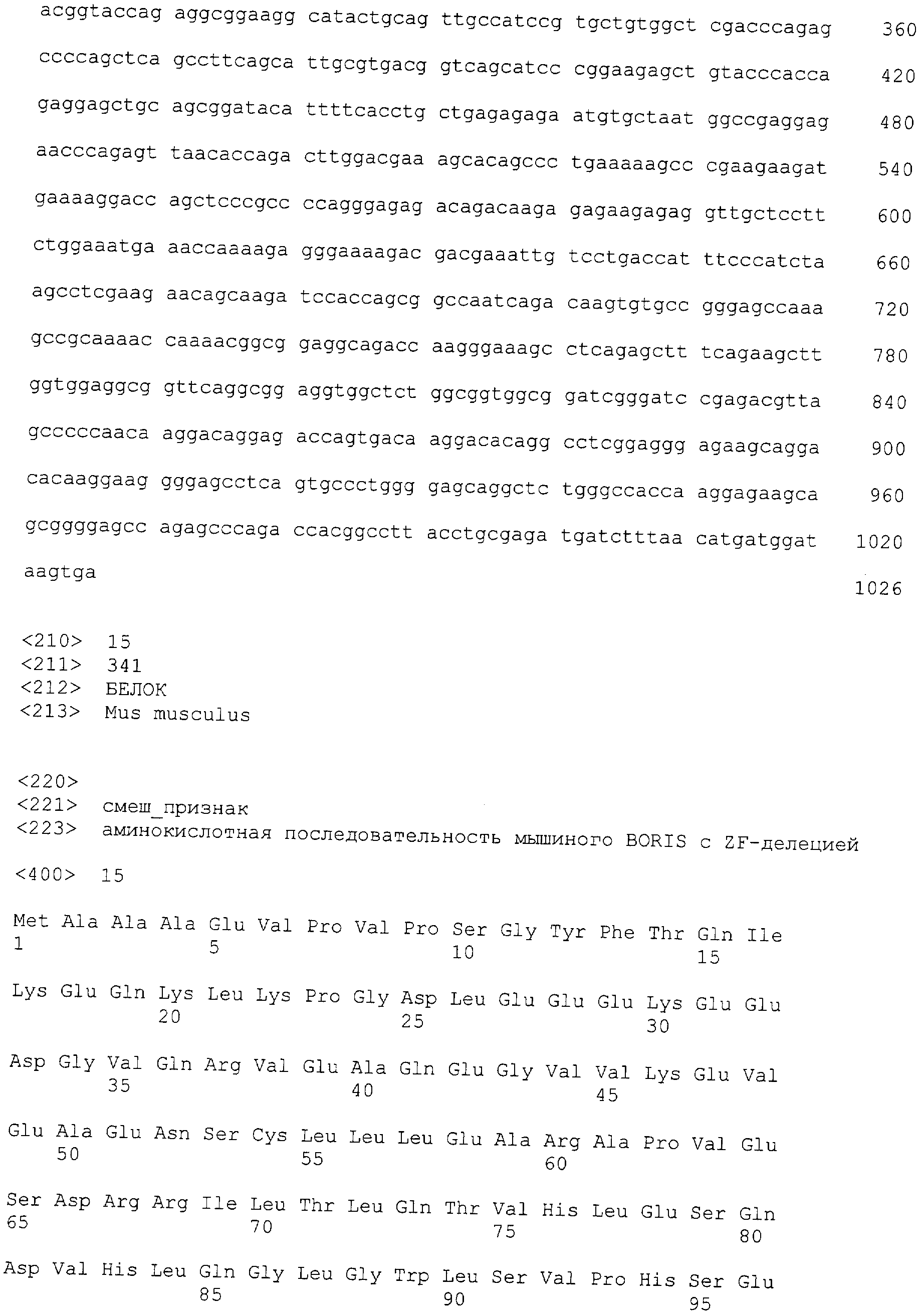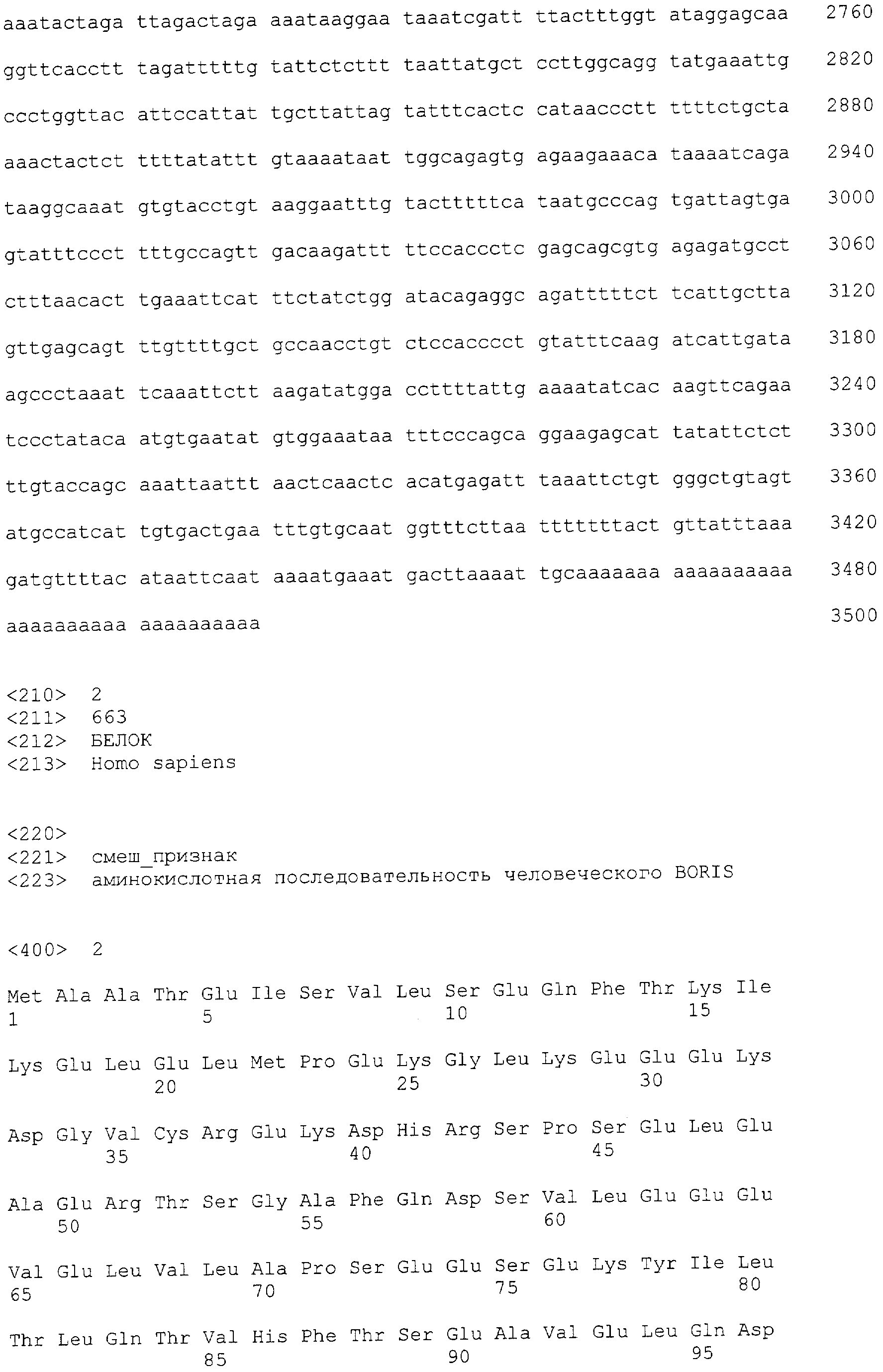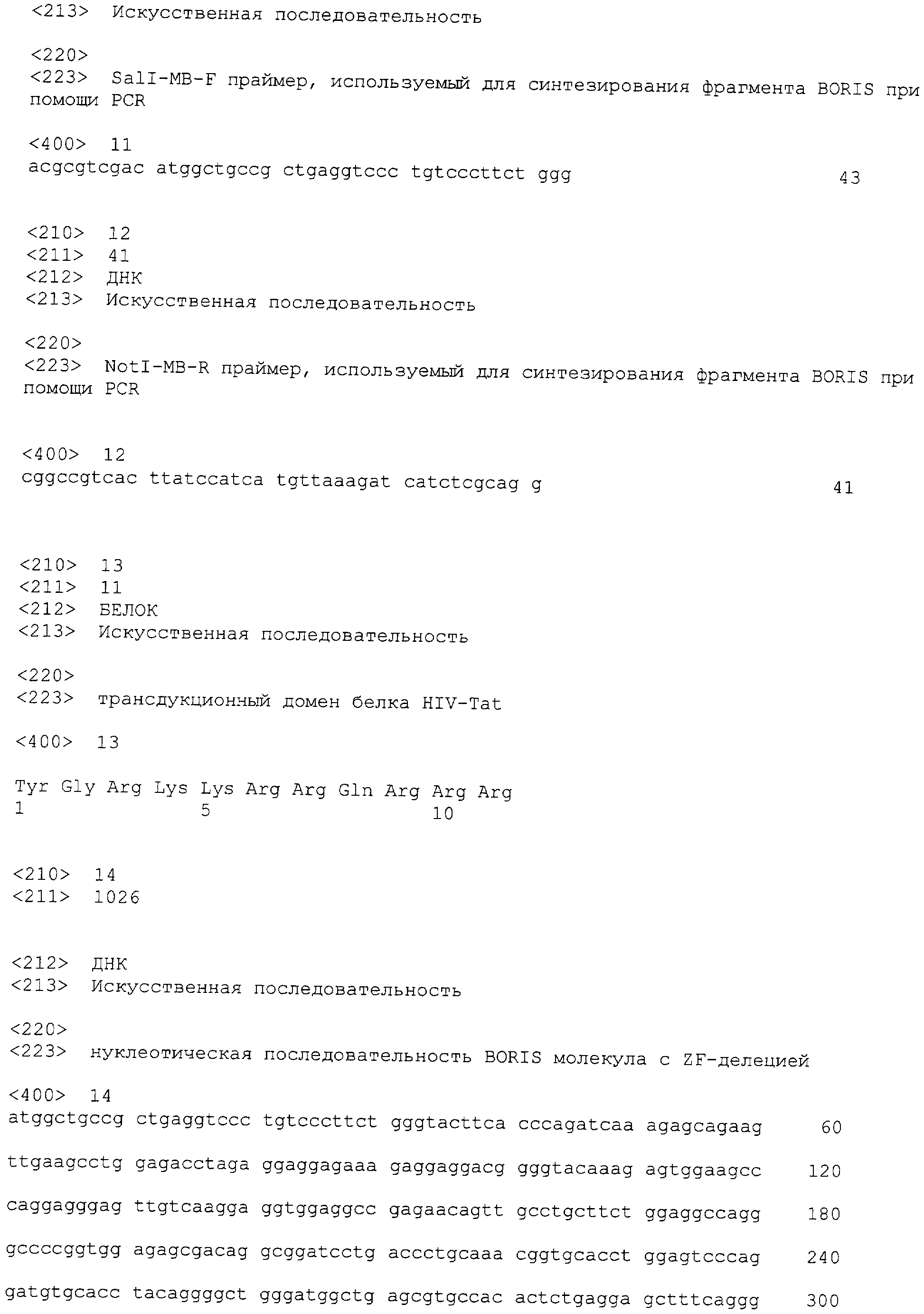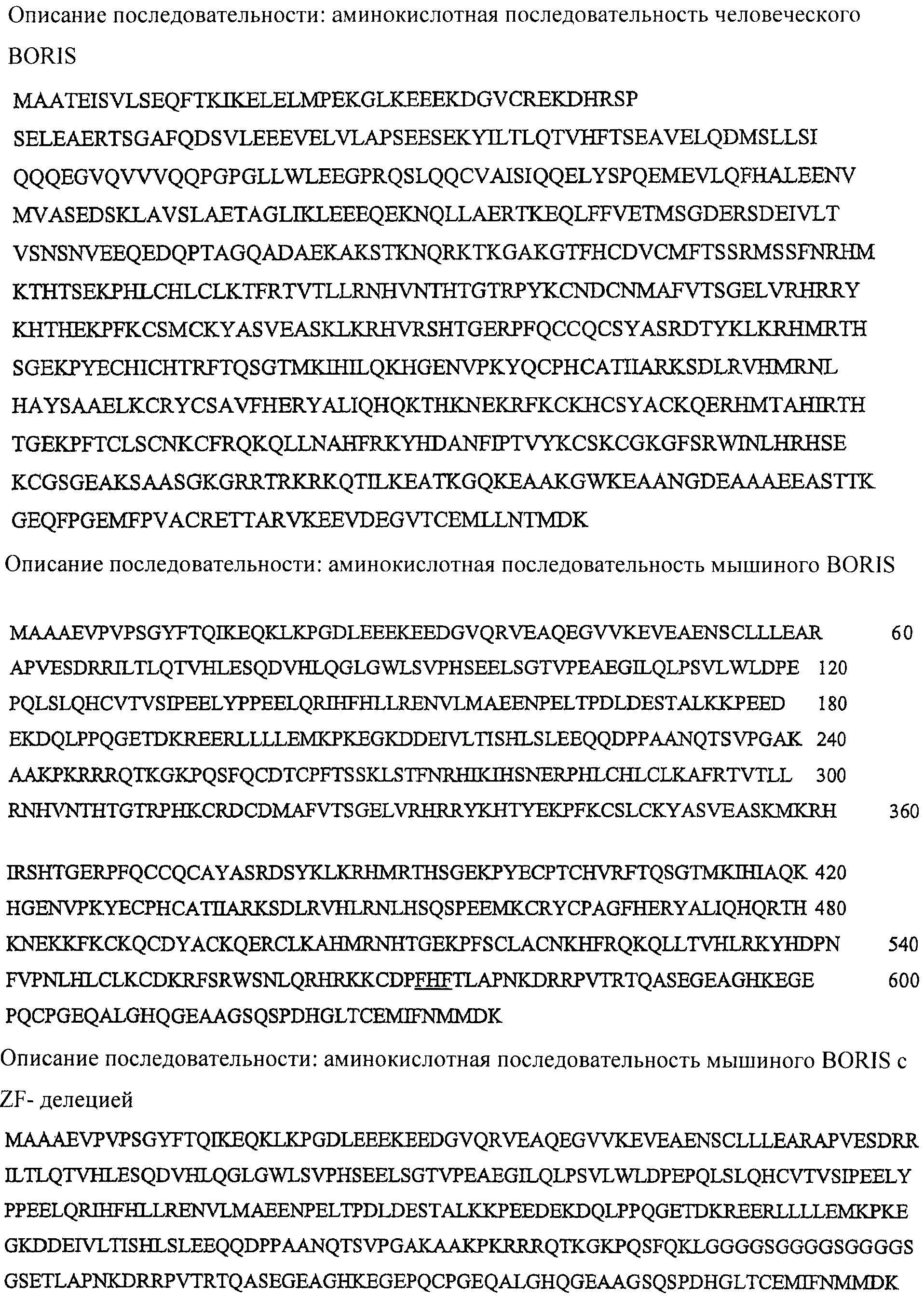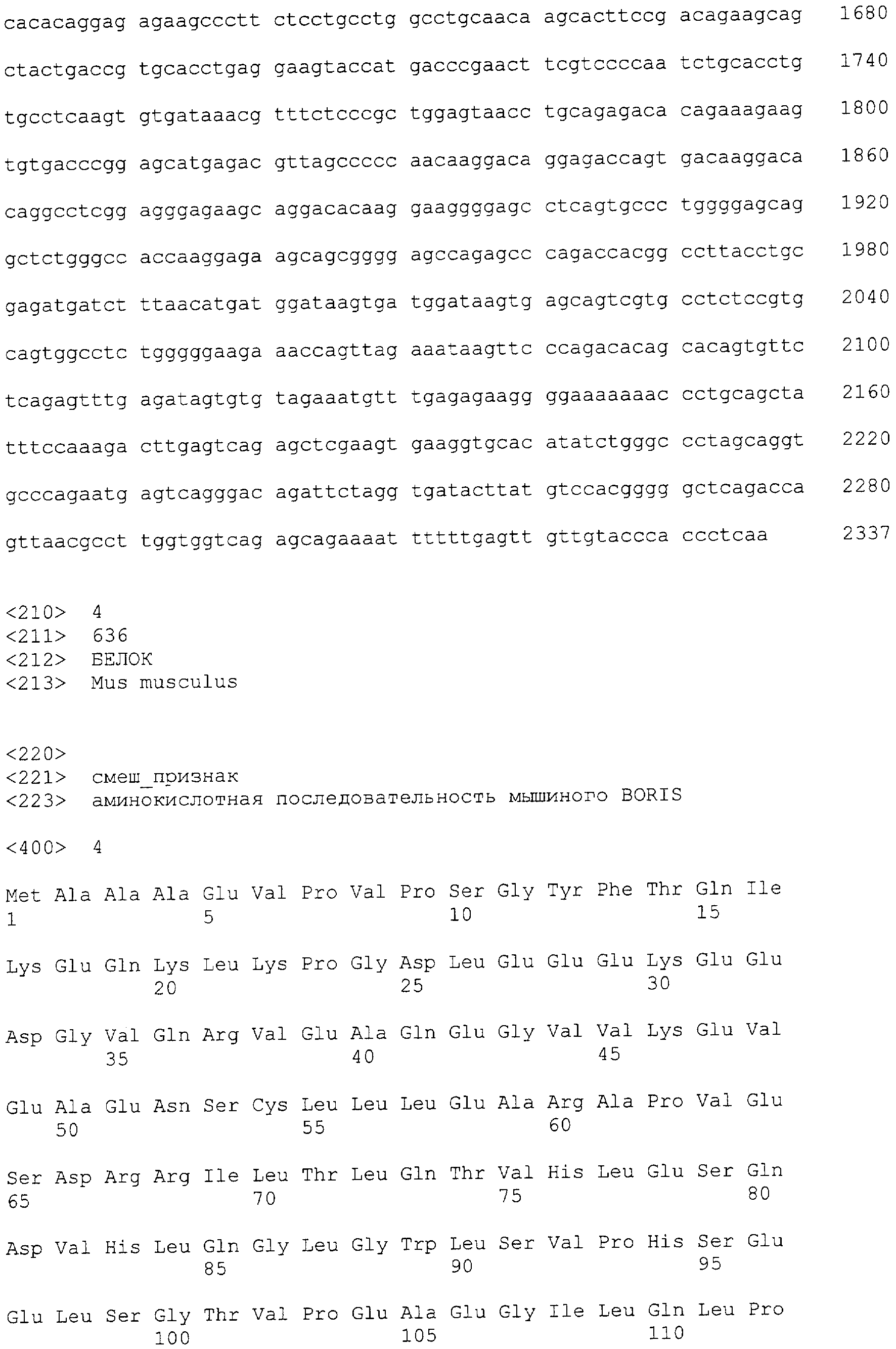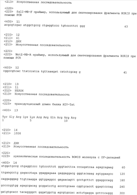 Кроме того, настоящее изобретение относится к нефункциональной модифицированной (мутантной) форме белка, полипептида или пептида BORIS. Нефункциональный мутант можно получать любым известным методом, который вводит в последовательность делеции, замены или добавления, что приводит в результате к нефункциональному белку. В предпочтительном варианте изобретения мутантный BORIS белок, полипептид или пептид лишен ДНК-связывающей способности. В другом предпочтительном варианте изобретения мутантный BORIS белок, полипептид или пептид смешивается с обычным адъювантом. Еще в одном предпочтительном варианте изобретения нефункциональный мутантный BORIS белок, полипептид или пептид связывается с фармацевтически приемлемым носителем (остов). Еще в одном предпочтительном варианте изобретения нефункциональный мутантный BORIS белок, полипептид или пептид связывается с пептидом, который модифицирует BORIS и сохраняет его антигенные свойства. Еще в одном предпочтительном варианте изобретения нефункциональный мутантный BORIS белок, полипептид или пептид связывается с областью белковой трансдукции (PTD).