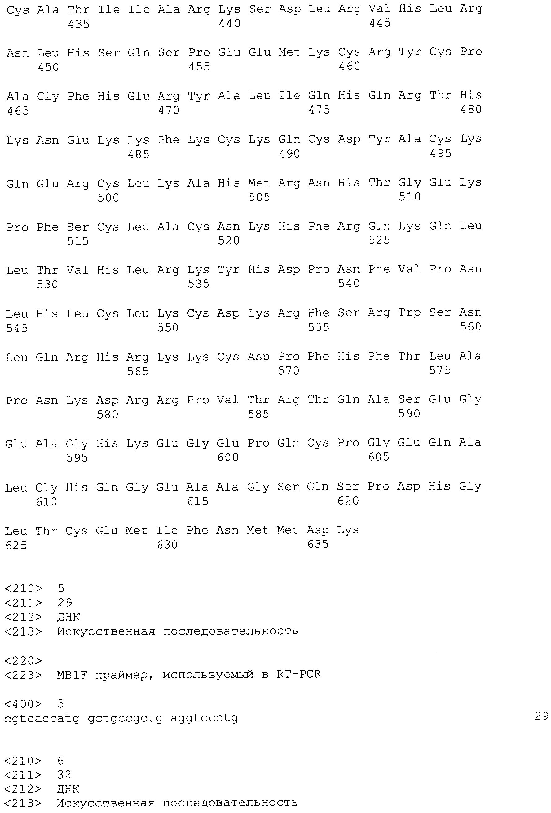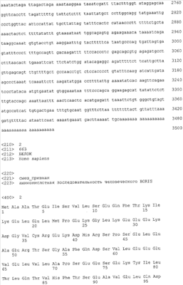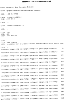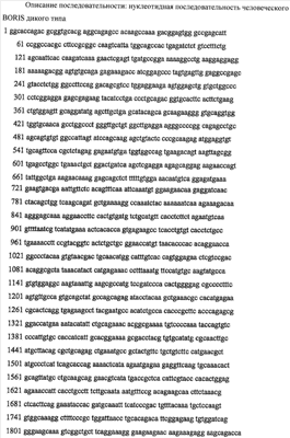 Позднее было показано, что хотя сверхэкспрессия CTCF также блокирует клеточную пролиферацию, экспрессия BORIS в нормальных BORIS-негативных клетках стимулирует рост клеток, который может привести к трансформации (Klenova et al (2002) Cancer Biol. 12: 399-414). Человеческий BORIS картирован в области 20ql3, которая общеизвестна по частым конверсиям и/или амплификациям, наблюдаемым во многих опухолях тех же типов, в которых также часто наблюдается потеря гетерозиготности (LOH) в паралогичных генах на 16q22, где расположен CTCF. Эти области ассоциированы с “горячими точками”, связанными с раком молочной железы, простаты, яичника, желудка, печени, эндометриального рака, злокачественной глиомы, рака толстой (ободочной) кишки и эзофагального рака, а также опухолей Вилмса. Важно, что аномальная активация экспрессии BORIS обнаруживается в значительном числе широкого ряда новообразований. Используя Нозерн-блоттинг или RT-PCR, Klenova et al (2002) проанализировали уровни мРНК BORIS в более чем 200 линиях клеток, представляющих большинство основных форм человеческих опухолей, и обнаружили транскрипты в более чем половине испытанных линий клеток. Последующий анализ первичного рака, для выборки рака молочной железы, подтвердил результаты, полученные с этими клеточными линиями.