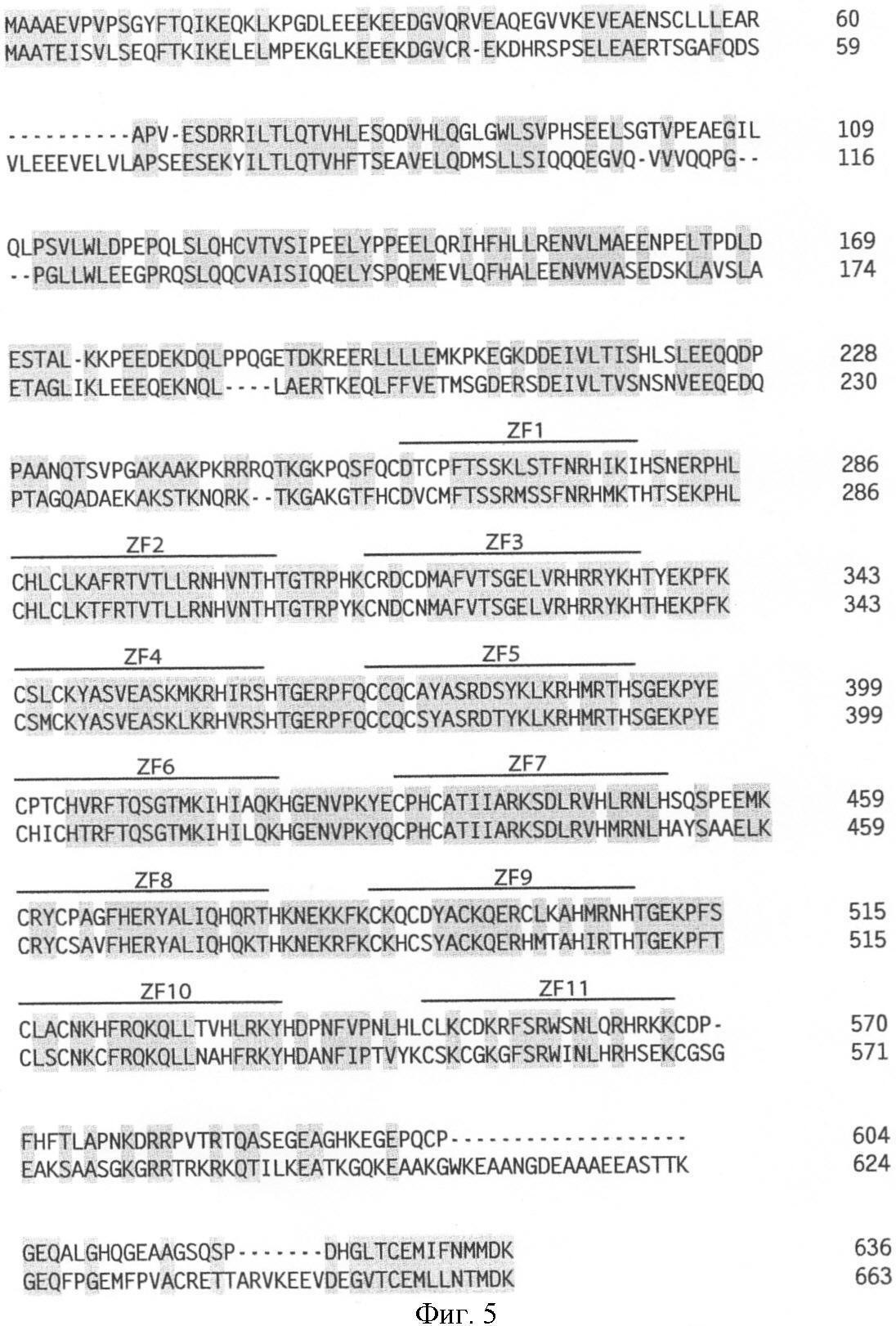 На Фигуре 5 показано выравнивание методом наилучшего приближения человеческого и мышиного BORIS полипептидов, осуществляемое с помощью пакета программ GCG, по умолчанию расширение гэпов принимается равным нулю, причем консервативные области цинковых пальцев выделены и указаны как ZF-11.