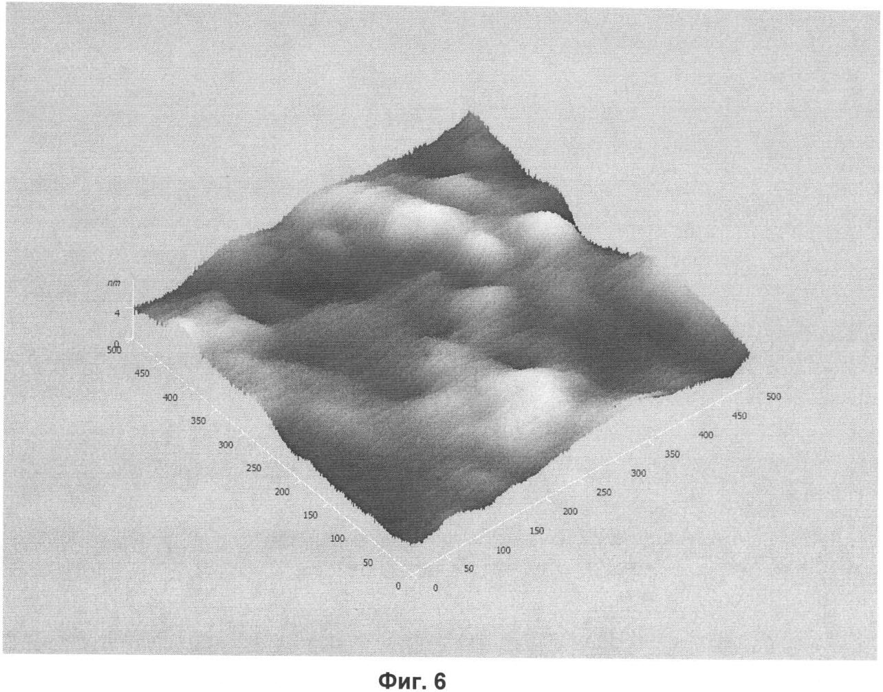 ПРИМЕР 2. Имплантат или протезируемый материал для нанесения бактерицидного покрытия размещают в вакуумной камере, где находятся высокотемпературные источники, предназначенные для испарения углерода и серебра вместе с ионными источниками инертных газов, после чего в вакуумной камере создают определенный вакуум. При достижении необходимого вакуума проводят предварительное очищение поверхности имплантата или протезируемого материала ионным пучком аргона. После очистки поверхности основы протезируемого материала 3 (фиг.3) методом импульсной конденсации углеродной плазмы наносят покрытие монокристаллического углерода толщиной 0.6-0.8 микрон. Одновременно с процессом осаждения монокристаллического углерода запускают второй высокотемпературный источник в импульсном режиме и проводят легирование углеродного покрытия атомами серебра, размеры которых равны 1,444·10-8 см, от 0,1 до 1%. Управление процессом легирования углеродного покрытия атомами серебра осуществляют по времени. Толщину получаемого бактерицидного покрытия регулируют также временем нанесения. Контроль толщины получаемого таким образом бактерицидного покрытия осуществляют с помощью атомного силового микроскопа (фиг.6).