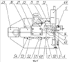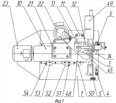 Прижим коллекторной пластины 14 (фиг.4) закреплен на рычаге 13 при помощи оси. Приводом поворота рычага 13 относительно оси 12 является гидроцилиндр 48, установленный на станине 1 (фиг.1).