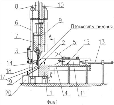 Ползун 7, к которому жестко прикреплен, например болтовым соединением, режущий инструмент 3, устанавливают в крайнее верхнее положение, подвижный упор 14 устанавливают в положение заданной величины реза L (~20 мм). Блок 5 губчатого титана устанавливают на опорную поверхность 15 стола 4 с зазорами К (5-10 мм) относительно бортов 16 таким образом, чтобы ось блока была размещена параллельно опорной поверхности 15 стола 4. Гидроцилиндр 13 перемещает манипулятор 11 до соприкосновения с блоком 5, захваты 12 охватывают верхушку блока 5, фиксируя его ось. Далее блок 5 перемещают манипулятором 11 на рабочую поверхность 2 станины 1 до выдвижения части блока 5 за плоскость резания, проходящую через режущую кромку инструмента 3 и кромку 17 рабочей поверхности станины 1, расположенной со стороны выемки 18 до соприкосновения с упором 14, подают давление в гидроцилиндры 8 и ползун 7 с режущим инструментом 3 совершает рез дефектного слоя со скоростью ~20 мм/сек, при этом подвижный упор 14 убран. Режущая кромка инструмента 3 двигается к плоскости 2 станины 1 и в конце хода опускается на 5-10 мм ниже рабочей плоскости 2 станины 1, все усилие резания воспринимается рабочей поверхностью станины 1. После окончания реза ползун 7 с режущим инструментом 3 поднимают в верхнее положение. Далее настраивают подвижный упор 14 на величину срезаемого слоя 30-40 мм и осуществляют послойную резку со скоростью 40-60 мм/сек. После каждого дискретного реза манипулятором 11 продвигают блок 5 до подвижного упора 14 и осуществляют его прижим. При резке верха блока (примерно 1/3-1/4 части длины блока 5) подвижный упор 14 настраивают на величину срезаемого слоя 40-60 мм, остатки блока 5 продвигают до подвижного упора 14 без использования захватов, опускают зажим 9, убирают подвижный упор 14 и совершают резку со скоростью 80 мм/сек. В процессе резания куски продукта падают на лоток 19, расположенный в выемке 18 станины 1, а затем в контейнер 20. После первичной резки куски губчатого титана вторично загружают на стол 4 с боковыми стенками 16 и подвергают дополнительному измельчению.