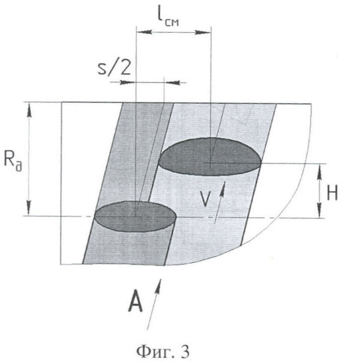На фиг.1 изображен предлагаемый способ обработки, на фиг.2 – вид А фиг.1. Схемы перекрытий следов от внедрения инструмента 1 и инструмента 2 представлены на фиг.3, фиг.4. На фиг.4 показан вид А фиг.3.