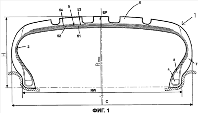 Предпочтительно, шина 1, соответствующая изобретению, относится к типу с заметно сплющенным сечением, а именно шина, соответствующая изобретению, предпочтительно, имеет соотношение геометрических размеров (H/C) от 0,20 до 0,65, более предпочтительно от 0,25 до 0,55, еще более предпочтительно от 0,25 до 0,45.