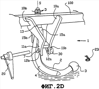 Затем пользователь кладет свою руку с нижней стороны штанги 4 сцепки и поднимает крюк 2 сцепки вверх в направлении, показанном стрелкой E, в положение, показанное на фиг.2E, в котором штанга 4 сцепки располагается рядом с пластиной 30. Пользователь обеспечивает условия, при которых отверстие 7 совмещается с отверстием 31 в пластине 30, а затем берет рукоятку 22 фиксирующего элемента 20 и сначала вставляет штифт 21 в отверстие 7 штанги 4 сцепки, а затем в отверстие 31 пластины 30. Пластина 30 может служить упором для штанги 4 сцепки, посредством которой можно предотвращать дальнейший поворот штанги 4 сцепки относительно оси S во время введения штифта 21. Наконец, он берет фиксирующий проволочный зажим 23 за его кольцо 23a и снова устанавливает фиксирующий проволочный зажим 23 на штифте 21, после чего оно заходит в канавку 24 на конце штифта и фиксирует конец штифта. Крюк 2 сцепки теперь закреплен в положении хранения, параллельном поперечной балке 100.