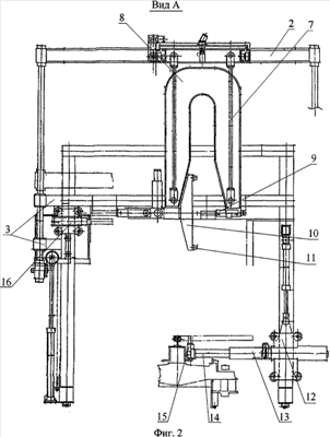 Сведения, подтверждающие возможность осуществления изобретения с получением вышеуказанного результата, заключаются в следующем: машина вагоноремонтная состоит из нижней части 1 (см. фиг.1) телескопической портальной рамы (далее рамы), поставленной на колеса для перемещения по рельсовому пути вдоль вагона и смонтированной на ней верхней части рамы 2, перемещающейся вертикально по направляющим 3 (см. фиг.2) с помощью гидроцилиндров 4. Наверху рамы 2 смонтирована тележка 5 (см. фиг.3), двигающаяся поперек вагона и содержащая поворотный механизм 6, на котором с помощью шарнирных тяг 7 закреплен силовой элемент – большая струбцина 8, на ней с одной стороны установлен гидроцилиндр 9, а с другой – поворотная балка 9 с реактивными опорами 11, имеющими возможность перемещаться от центра к концам балки. Внизу рамы 1 портала с каждой его стороны на нижней части рамы 1 установлены каретки с грузоподъемным механизмом 12, там же установлен механизм правки люков, представляющий поворотную телескопическую балку 13 с гидроцилиндром на конце и выдвижной опорой 14 для создания реакции, на которых закреплены вращающиеся вокруг своей оси малые струбцины 15, при этом правильные домкраты 16 установлены на центральных колоннах с обеих сторон рамы и представляют собой гидроцилиндры, которые перемещаются вдоль борта в вертикальном направлении при помощи тяг (не показано), соединенных с верхней рамой 2 портала. На нижней части рамы 1 смонтированы рабочие площадки (на чертеже не показаны), которые служат для обслуживания, где помещается пульт управления оператора.