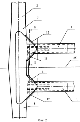 Сварку вертикальных ребер жесткости со стенкой 22 боковой балки осуществляют с использованием предусмотренных в стенках, в основаниях поперечин торцевых вырезов. Перед сборкой последующих соединительных элементов коробчатого узла торцевые вырезы 19 заваривают планками 21, крепящими боковую балку сварочными швами 23 и 24 к поперечинам.