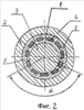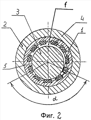На фиг.1 (продольное сечение) и фиг.2 (поперечное сечение) изображено предлагаемое устройство, где: 1 – дейдвудная втулка; 2 – внешний металлический корпус гребного подшипника; 3 – шейка гребного вала; 4 – планка вкладыша; – угол контактной зоны трения шейки гребного вала. Вкладыши установлены по специальной технологии, с расчетным натягом в пазах и расчетным радиальным зазором f и эксцентриситетом е. Расчет прессовой посадки позволяет надежно удерживать вкладыш от продольного перемещения при высоких удельных нагрузках валопровода с винтом в режимах реверсирования и ударных нагрузках при работе во льдах. Ширина рабочей антифрикционной поверхности вкладыша (рабочей поверхности скольжения) рассчитана применительно к условиям нагрузки и обеспечивает режим жидкостного трения на малых оборотах гребного вала при работе во льдах. Все это в совокупности обеспечивает высокие эксплуатационные преимущества заявляемого гребного устройства. Устройство используют следующим образом.