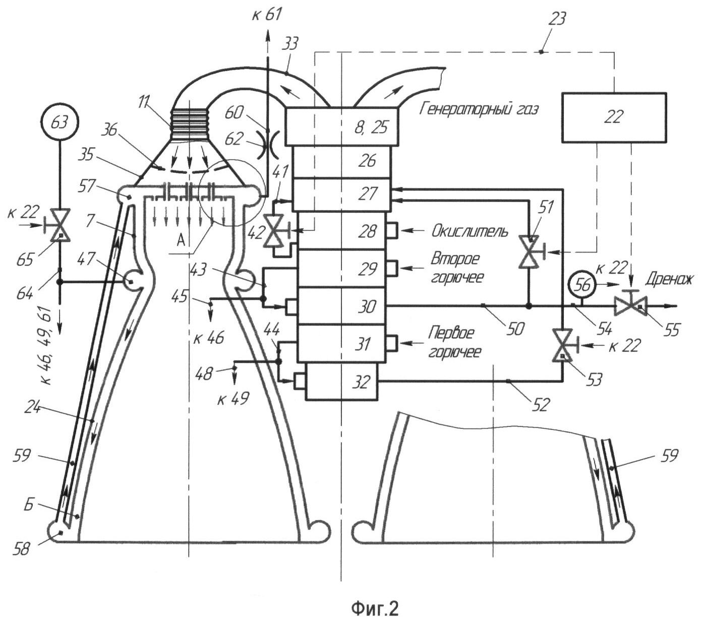 Схема охлаждения камеры сгорания 1 двигателя приведена на фиг.4. К основному коллектору горючего 47, который установлен в районе критического сечения сопла камеры сгорания 7, подведены трубопроводы 45 и 48. В верхней части камеры сгорания 7 выполнен верхний коллектор горючего 57, а в нижней части сопла 3 – нижний коллектор горючего 58, эти коллекторы соединены трубопроводами переброса горючего 59 (применено от 2-х до 4-х трубопроводов переброса горючего). К трубопроводу 45 (фиг.4) присоединен трубопровод перепуска 60 с клапаном перепуска 61 и дросселем 62. Для обеспечения качания камеры сгорания 7 при управлении вектором тяги двигателя 6 камера сгорания 7 может быть оборудована сильфоном 2, установленным над головкой 35 камеры сгорания 7. Аналогичные сильфоны установлены в трубопроводах первого и второго горючего (на фиг.1 4 не показано).