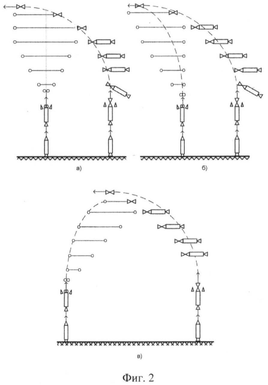 Способы передачи рабочего вещества для КЛА, стартующих с планеты в космос, представлены на фиг.2. С поверхности планеты стартуют ЛАЗ и КЛА. После прохождения плотных слоев атмосферы и достижения заданной высоты ЛАЗ выбрасывает запасы рабочего вещества. Рабочее вещество формируется в виде шнура (последовательности отрезков шнуров), который в зоне поглощения шнура двигателем ориентирован максимально параллельно вектору горизонтальной составляющей скорости КЛА. Одновременно с процессом формирования шнура рабочего вещества происходит сближение КЛА и шнура. При этом ускорение ЛАЗ и КЛА по вертикали во время баллистического полета (движения по инерции) синхронно. Процесс организован так, что после полного формирования шнура РВ происходит его встреча с КЛА и начинается вхождение в прямоточный реактивный двигатель. Далее происходит извлечение энергии шнура в ПРД и разгон КЛА вдоль шнура (последовательности шнуров, аналогичной пунктирной линии, сформированной другими ЛАЗ).