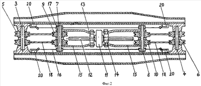 Один конец гибких грузонесущих элементов закреплен на балке 1 (не показано), а второй оснащен проушинами 19 для соединения с такелажными узлами выгружаемого из шахты изделия (или загружаемого в нее).