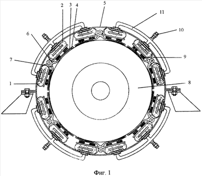 Буровой тормоз (фигура 1) состоит из разъемных частей с независимым пневмоуправлением. Каждая разъемная часть включает резинокордные баллоны 1, 2, колодки 3, облицованные фрикционными накладками 4, закрепленные на ободе 5. Обод 5 состоит из верхней и нижней частей. Разъемные части попарно соединены двумя коромыслами (двуплечими рычагами) 6 и 7, соответственно плечи 6а и 7а прилегают к резинокордным баллонам 1 и 2, а плечи 6б и 7б прилегают к тормозному шкиву 8 (фигура 2). Коромысла (рычаги) 6 и 7 шарнирно закреплены на ободе 5 и повернуты относительно друг друга на 180°. На плечах коромысел (рычагов) 6б и 7б, соприкасающихся с тормозным шкивом 8, крепятся колодки 3 с фрикционными накладками 4. Между коромыслами (рычагами) 6 и 7 установлены пружины 9. При проведении работ по спуску резинокордные баллоны 1 и 2, оснащенные пружинами, способствуют наиболее быстрому расцеплению фрикционных накладок 4 с тормозным шкивом 8.