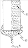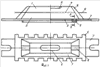 Продольный разрез фильер 9 с профилированным каналом 10 и истекающей струей 11 расплава базальта представлены на фиг.2, – разрез А-А на фиг.1., на фиг.3 представлен продольный разрез фильер с цилиндрическим каналом 12 щелевого фильерного питателя-прототипа с каплеобразной струей 13 расплавленного базальта на срезе выходного отверстия фильер.