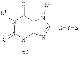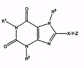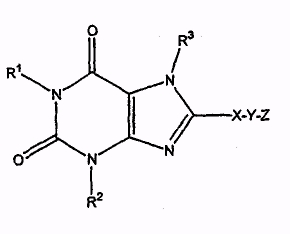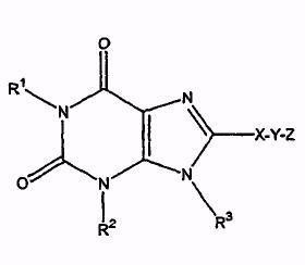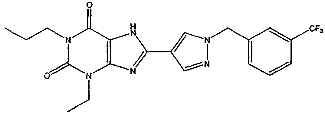 7. Фармацевтическая композиция по п.5, где R1 представляет собой н-пропил, R2 представляет собой этил, Y представляет собой -СН2-, и Z представляет собой 3-(трифторметил)фенил, а именно 3-этил-1-пропил-8-{1-[(3-трифторметил)фенил]метил}пиразол-4-ил}-1,3,7-тригидропурин-2,6-дион.
