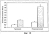 На фиг.10 изображен график, показывающий титры антител сывороток кроликов, иммунизированных гликолипидом формулы В. Титры антител, измеренные описанным ниже методом ELISA, представляют собой среднее значение, полученное для четырех разных сывороток кроликов, разведенных в отношении 1:100, каждая из которых была подвергнута трем независимым анализам. Незаштрихованные столбцы, титры IgG; серые столбцы, титры IgM; линии над столбцами показывают стандартные отклонения.