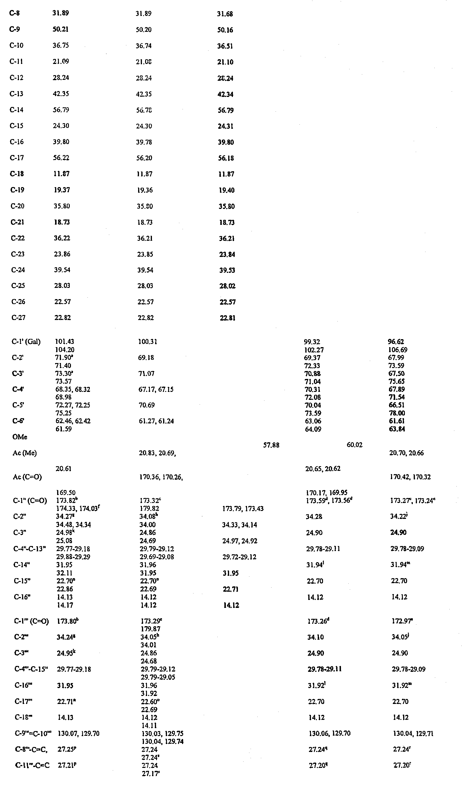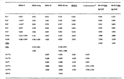 Размер кольцевой структуры сахара для BBGL-II и BBGL-II-Ac3 был определен на основании сходства констант взаимодействия кольцевых структур сахара с константами взаимодействия метил- -D-галактопиранозида (таблица IV). Различия в значениях J5′,6’a и J5′,6’b для BBGL-II и BBGL-II-Ac3, с одной стороны, и метил- -D-галактопиранозида, с другой стороны, могут быть отнесены за счет разных ротамерных распределений относительно связи С-5′-C6′, вызванных наличием большого заместителя в положении О-6′ гликолипидов. Данные ЯМР для BBGL-II-Ac3 совместимы с результатами его исследования в виде смеси 3-О-(2,3,4-три-О-ацетил-6-О-пальмитоил- -D-галактопиранозил)холестерина и 3-О-(2,3,4-три-О-ацетил-6-О-олеоил- -D-галактопиранозил)холестерина.