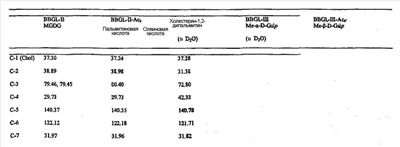 Остальные пять резонансов СН в диапазоне 101,43-68,32 м.д. были соотнесены с С-1′-C-5′ галактозы, которая также давала сигнал СН2 при 61,3 м.д. (таблица III). Было обнаружено удвоение сигналов С-4′, C-5′ и С-6′ галактозы, которое можно было объяснить наличием двух гликолипидов, имеющих разные сложноэфирные группы жирных кислот (пальмитоильная и олеоильная) в положении О-6′ галактозы. Наблюдаемое удвоение сигнала С-3 холестерина труднее объяснить подобным образом, так как С-3 более удален от заместителя в положении О-6′ галактозы, чем С-4′, C-5′ и С-6′. Подобное удвоение может быть следствием поворотной изомерии относительно связи С-1′-O-1′ (25).