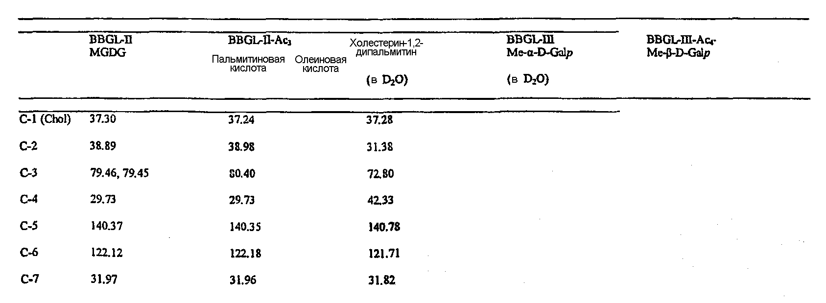 В 13С ЯМР-спектре BBGL-II было обнаружено 59 основных разрешенных резонансов, из которых пять относились к ядрам четвертичного 13С, то есть не были обнаружены при выполнении 13С спектроскопии методом DEPT. В направлении от слабого поля к сильному полю (таблица III) пять резонансов четвертичного 13С были определены как два карбонильных резонанса сложного эфира и С-5 (олефиновый), С-13 и С-10 резонансы холестериновой части. Из общего числа резонансов 13С 15 можно было идентифицировать как СН в результате редактирования спектра методом DEPT (фиг.3а), вместе с 27 группами СН2 и шестью группами СН3 (фиг.3b). Пять резонансов СН3 были соотнесены с остатком холестерина (таблица III), и шестой более слабый резонанс при С 14,13 был соотнесен с комбинацией сигналов атомов углерода -метила сложноэфирных групп жирных кислот, которые обычно не могут быть отделены друг от друга. Два основных резонанса олефиновой группы СН при ~130 м.д. были соотнесены с преобладающей сложноэфирной группой ненасыщенной жирной кислоты (олеиновая кислота, 18:1), хотя дополнительные более слабые резонансы в данной области указывали на наличие небольшого числа других сложноэфирных групп ненасыщенных жирных кислот. Резонансы СН при 122,12 и 76,46 м.д. были соотнесены с С-6 и С-3 холестериновой части. Хорошее соответствие было достигнуто между химическими сдвигами 13С BBGL-II и аналогичными сдвигами его липидных компонентов, холестерина, пальмитиновой кислоты и олеиновой кислоты за исключением ядер, расположенных рядом с местами присоединения остатков (таблица III). Показатели 13С для холестерина в растворе d в хлороформе основаны на результатах, приведенных в публикации (24) для раствора d5 в пиридине, причем данные показатели были совместимы с результатами экспериментов методом DEPT.