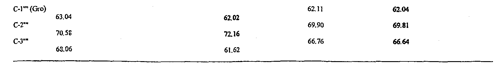 Высокое значение J1′,2′ 7,3 Гц и низкое значение JC-1′,H-1′ 160,2 Гц (таблица IV) подтвердили, что MGDG имеет -аномерную конфигурацию, то есть конфигурацию, противоположную конфигурации гликолипида BBGL-III. Объединенные данные ЯМР и ЖХ-МC для MGDG показывают, что данное соединение является по существу 1,2-ди-О-стеароил-3-О- -D-галактопиранозилглицерином, хотя более слабые пики в спектрах ЯМР и ЖХ-МС свидетельствовали о наличии небольших количеств других элементов. Диастереомерная взаимосвязь MGDG и BBGL-III и отсутствие остатка ненасыщенной жирной кислоты в MGDG являются достаточным фактором, определяющим разную растворимость двух указанных гликолипидов. В отличие от всех других исследованных липидов для растворения MGDG в CDCl3 необходимо добавить примерно 20% CD3OD.