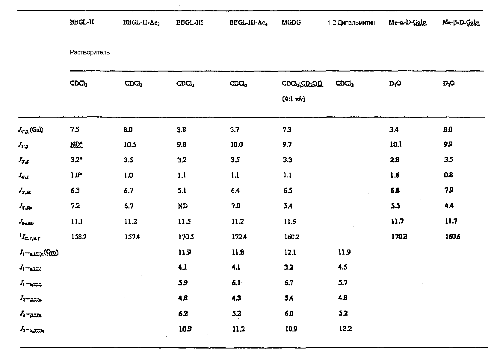 Данные ЯМР для BBGL-III совместимы со структурой 3-О- -D-галактопиранозил-1(2)-О-олеоил-2(1)-О-пальмитоилглицерина, и данные ЯМР для BBGL-III-Ac4 подтверждают наличие структуры 3-О-(2,3,4,6-тетра-О-ацетил- -D-галактопиранозил)-1(2)-О-олеоил-2(1)-О-пальмитоилглицерина. Определение величины кольцевой структуры сахара было основано на сходстве констант взаимодействия кольцевой структуры сахара с константами взаимодействия метил- -D-галактопиранозида (таблица IV).